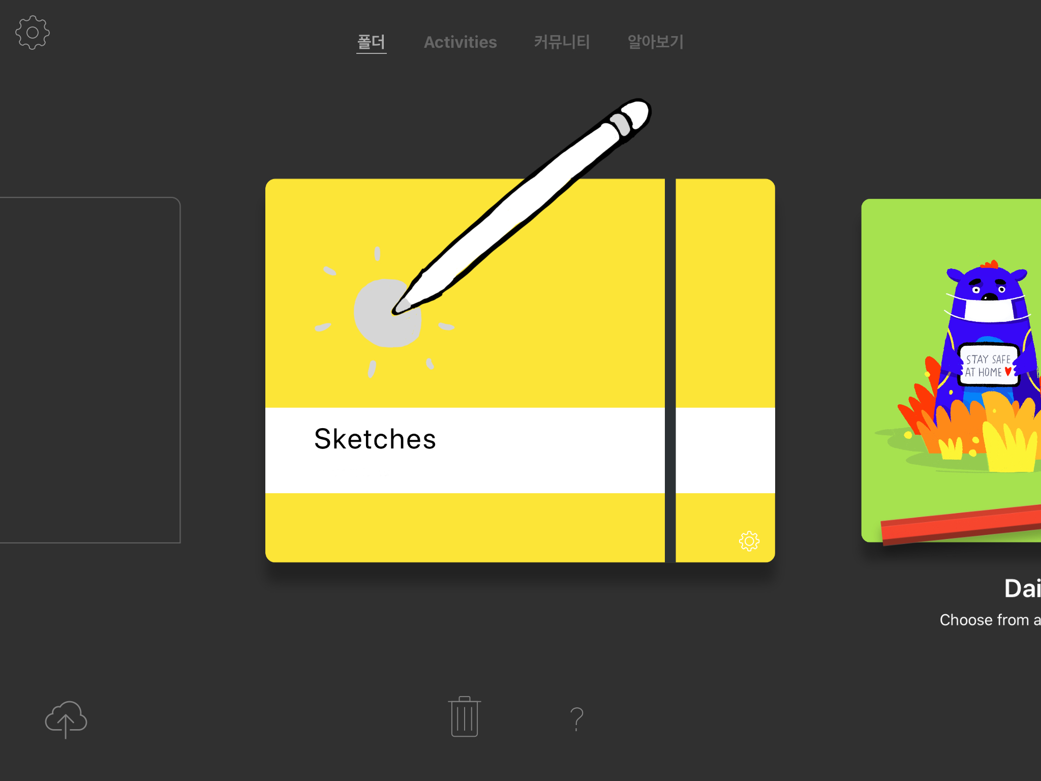 스케치스 사용방법은 정말 간단합니다. 처음 화면에 보이는 폴더(노란색 노트 모양)를 선택해준 뒤, [+] 버튼을 눌러 새문서를 열어주면 됩니다.