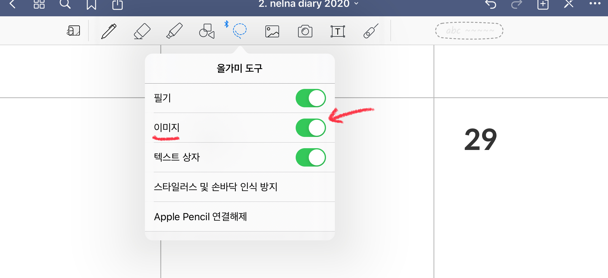 저는 아이패드 굿노트5 필기 어플을 자주 사용하고 있습니다. 그런데 아이패드 굿노트에 글씨를 쓰다 보면 삐침 현상이 있는데요. 가끔 신경 쓰일 때가 있어요. 오늘은 아이패드 굿노트 다이어리에 조금 더 예쁘게 글씨를 쓰고 싶을 때 사용할 수 있는 방법을 알려드리도록 하겠습니다.