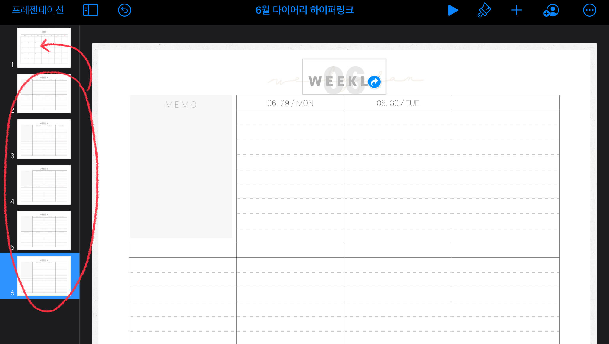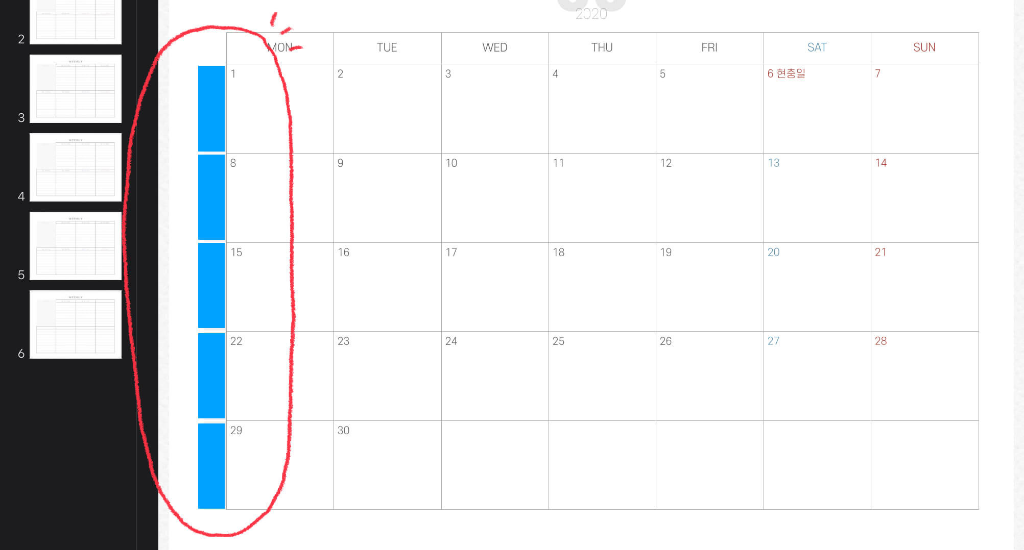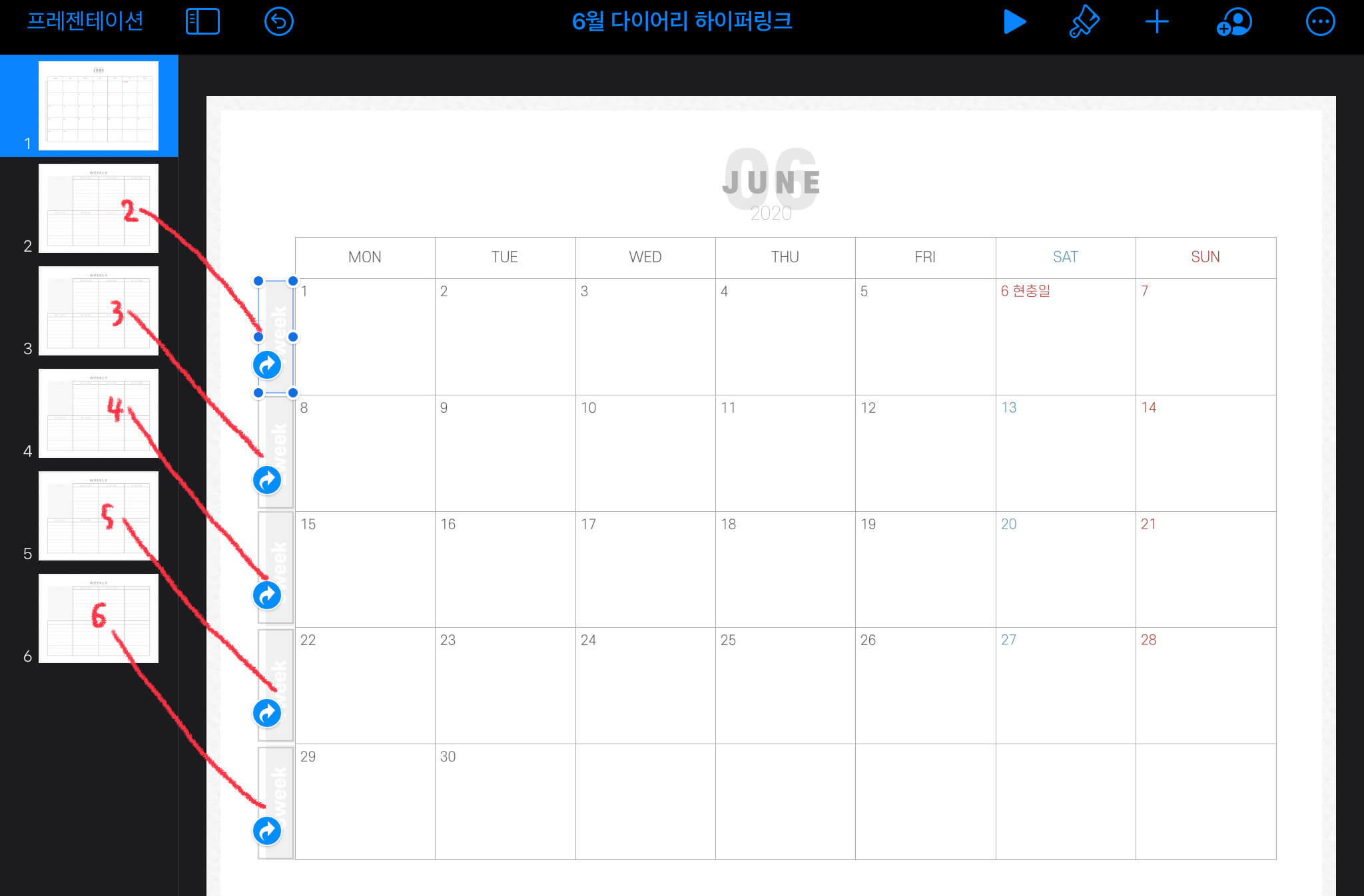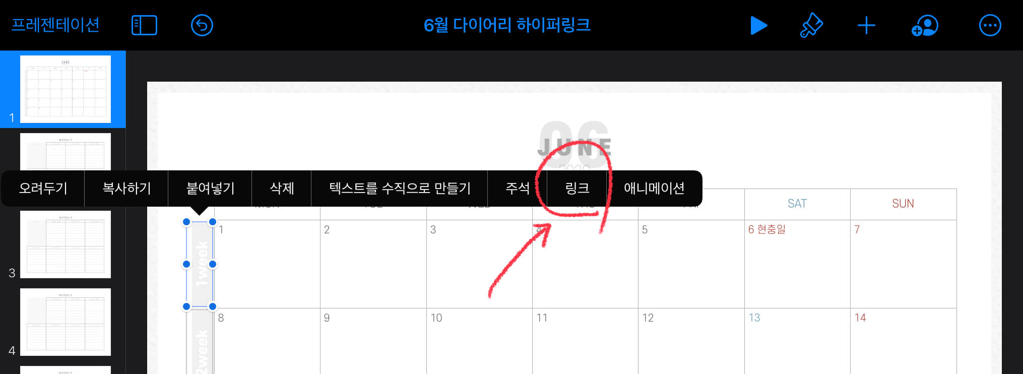 추가적으로 주간 플래너에서 월간 다이어리로 넘어가는 하이퍼링크도 만들어줍니다.