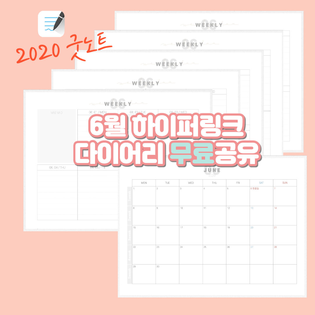 안녕하세요. 오늘은 아이패드 굿노트 6월 다이어리를 공유하겠습니다. 월간(Monthly) 플래너 1장과 주간(Weekly) 5장으로 구성되어 있습니다. (페이지 가장 하단에서 다운로드하시면 됩니다.) 그리고 오늘 서식공유와 함께 하이퍼링크 속지 만드는 방법을 알려드리도록 하겠습니다.