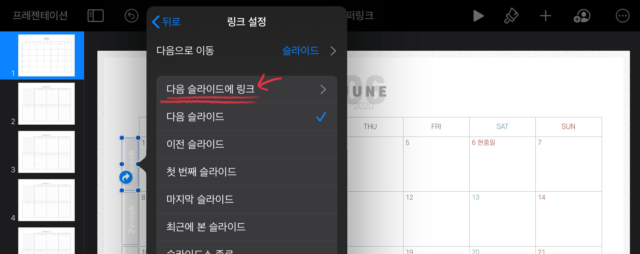 [다음 슬라이드에 링크]를 선택한 뒤, 연결해 줄 페이지를 선택합니다.