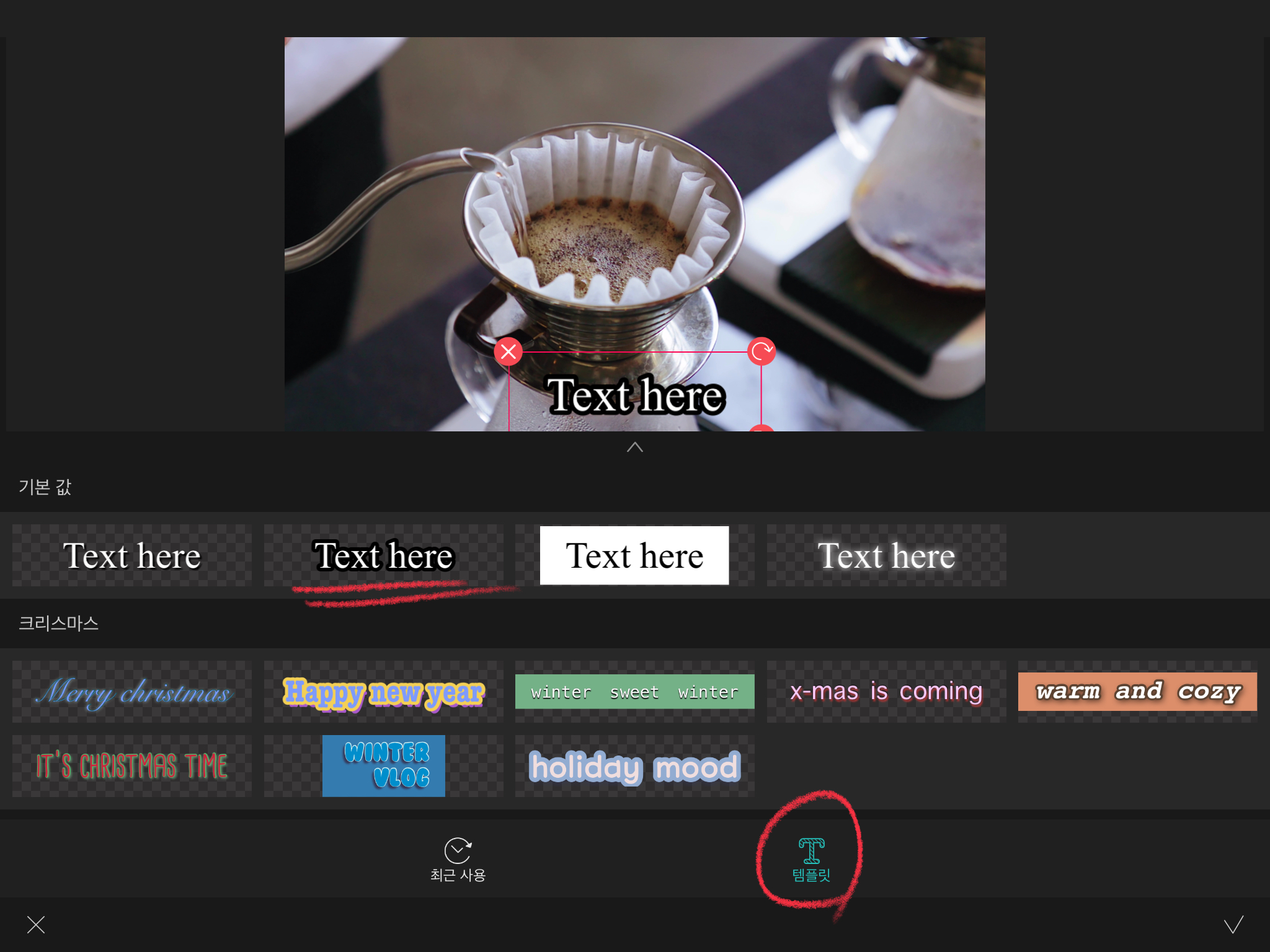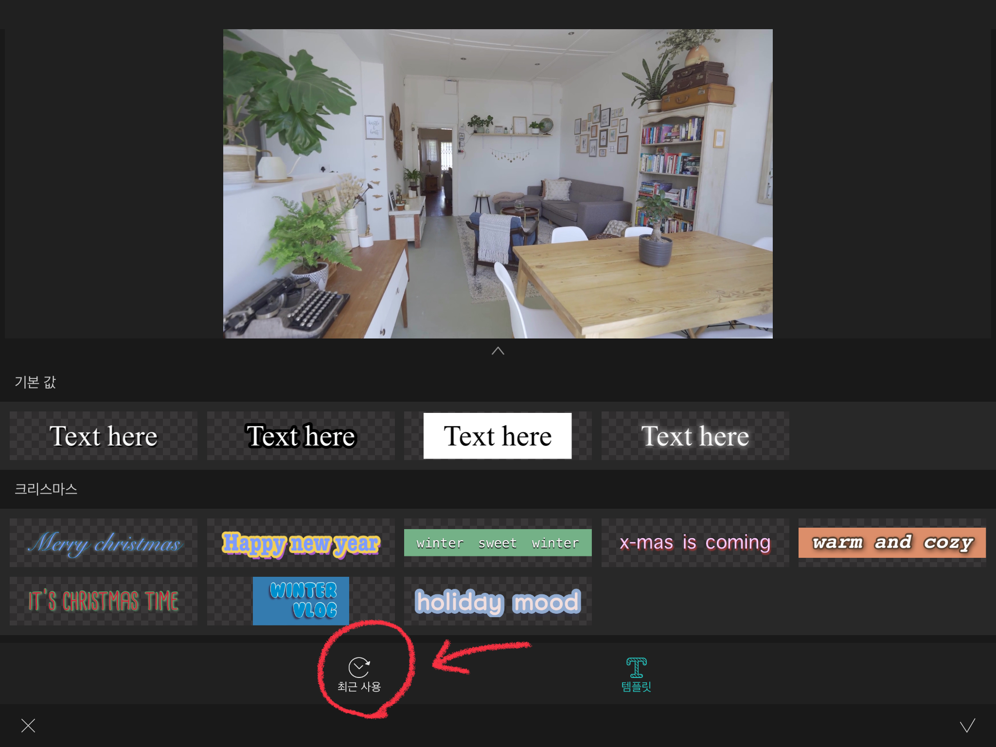 이 곳에 들어가면 최근에 사용한 자막들을 [즐겨찾기] 할 수 있습니다. 템플릿으로 지정을 해주는 기능입니다.