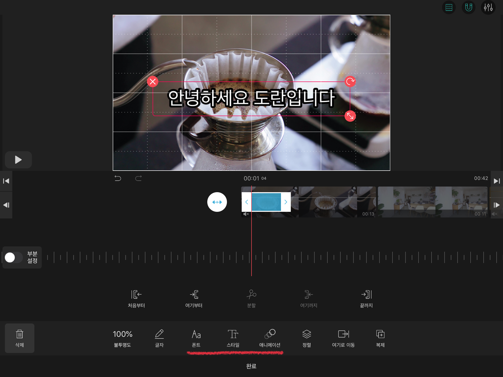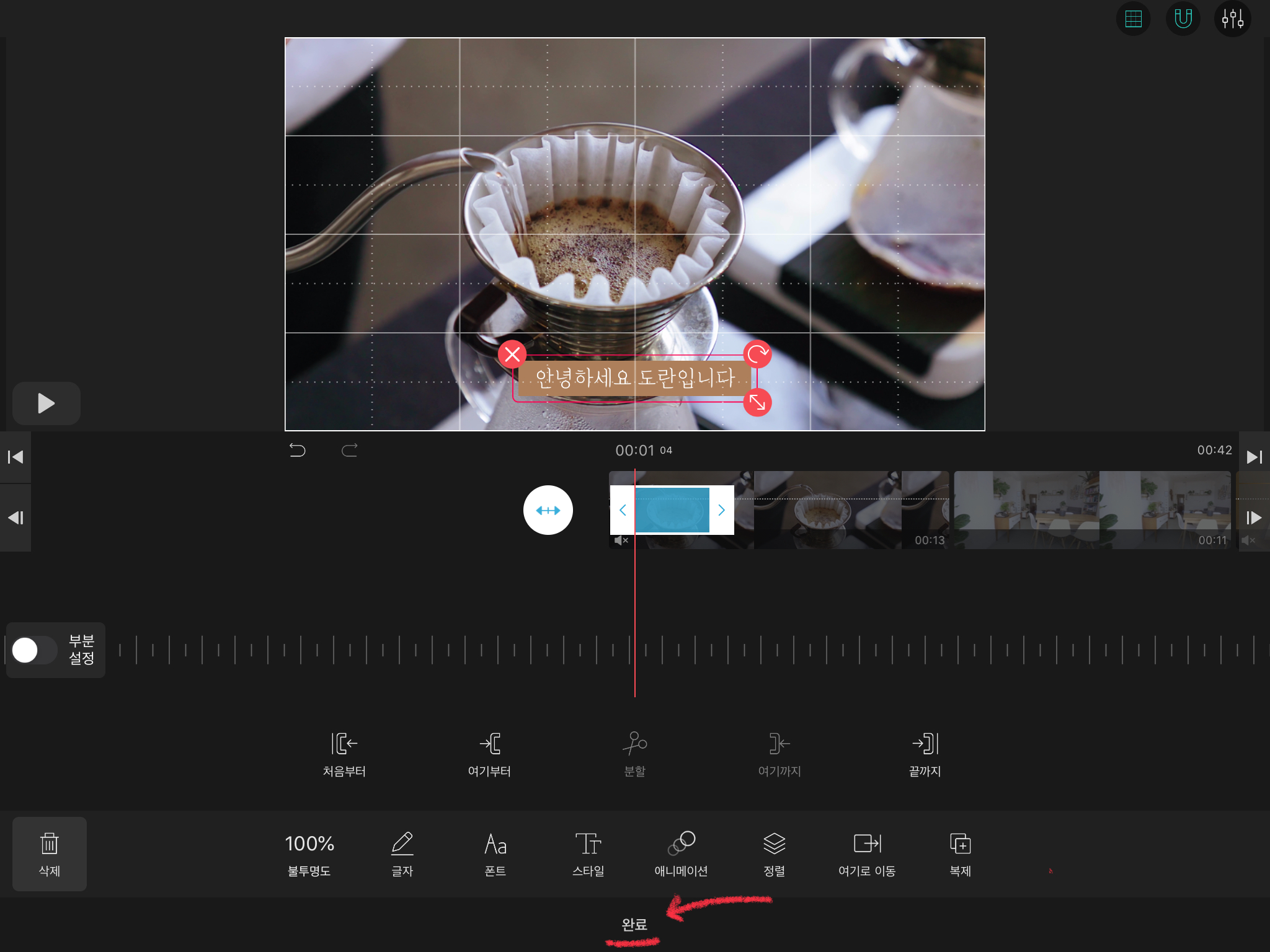저는 흰색에 갈색 바탕이 있는 고운밤체를 이용한 자막을 만들어 주었습니다. [완료] 버튼을 눌러주세요.