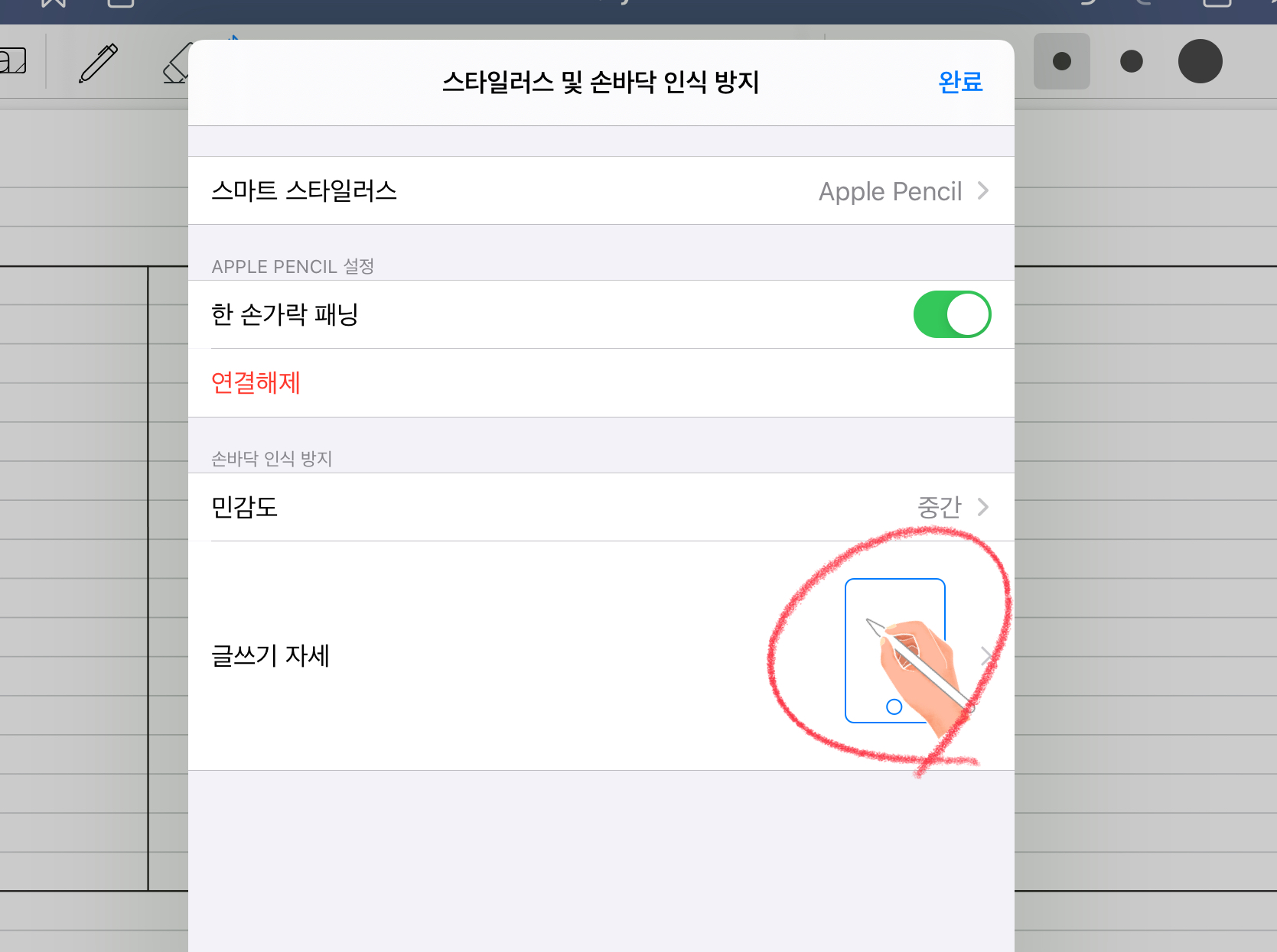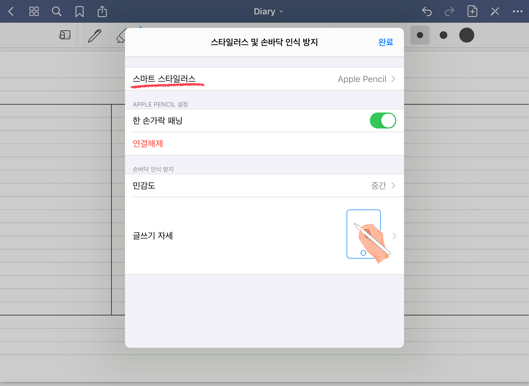 굿노트로 돌아가 보겠습니다. 굿노트를 켜주신 후 볼펜 혹은 지우개 혹은 하이라이터 등을 눌러주면, [스타일러스 및 손바닥 인식 방지] 메뉴가 보입니다. 그 메뉴를 터치하면 아래와 같은 화면이 나옵니다.