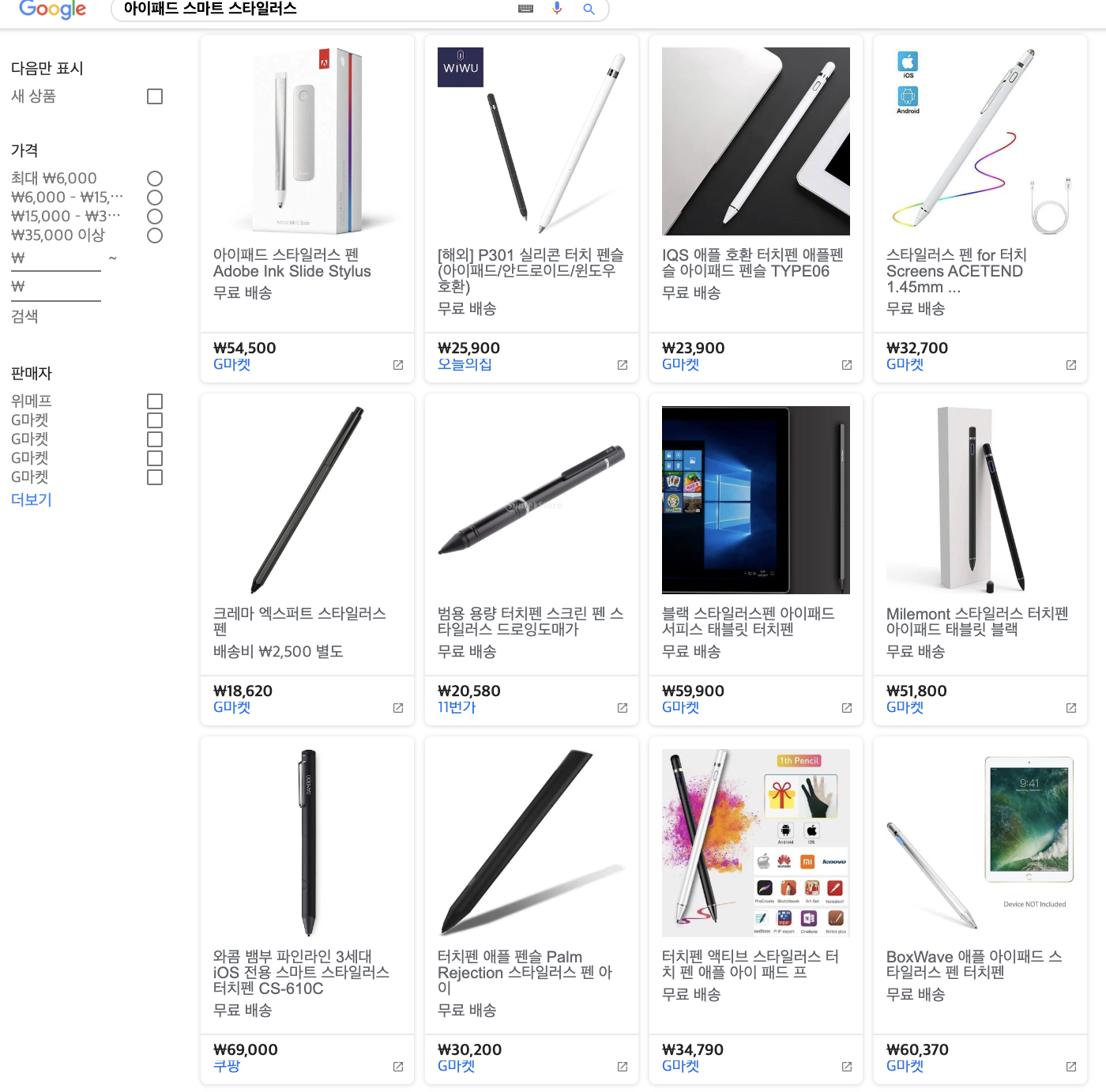 스타일러스를 검색하면 아래와 같이 다양한 제품들이 나옵니다.