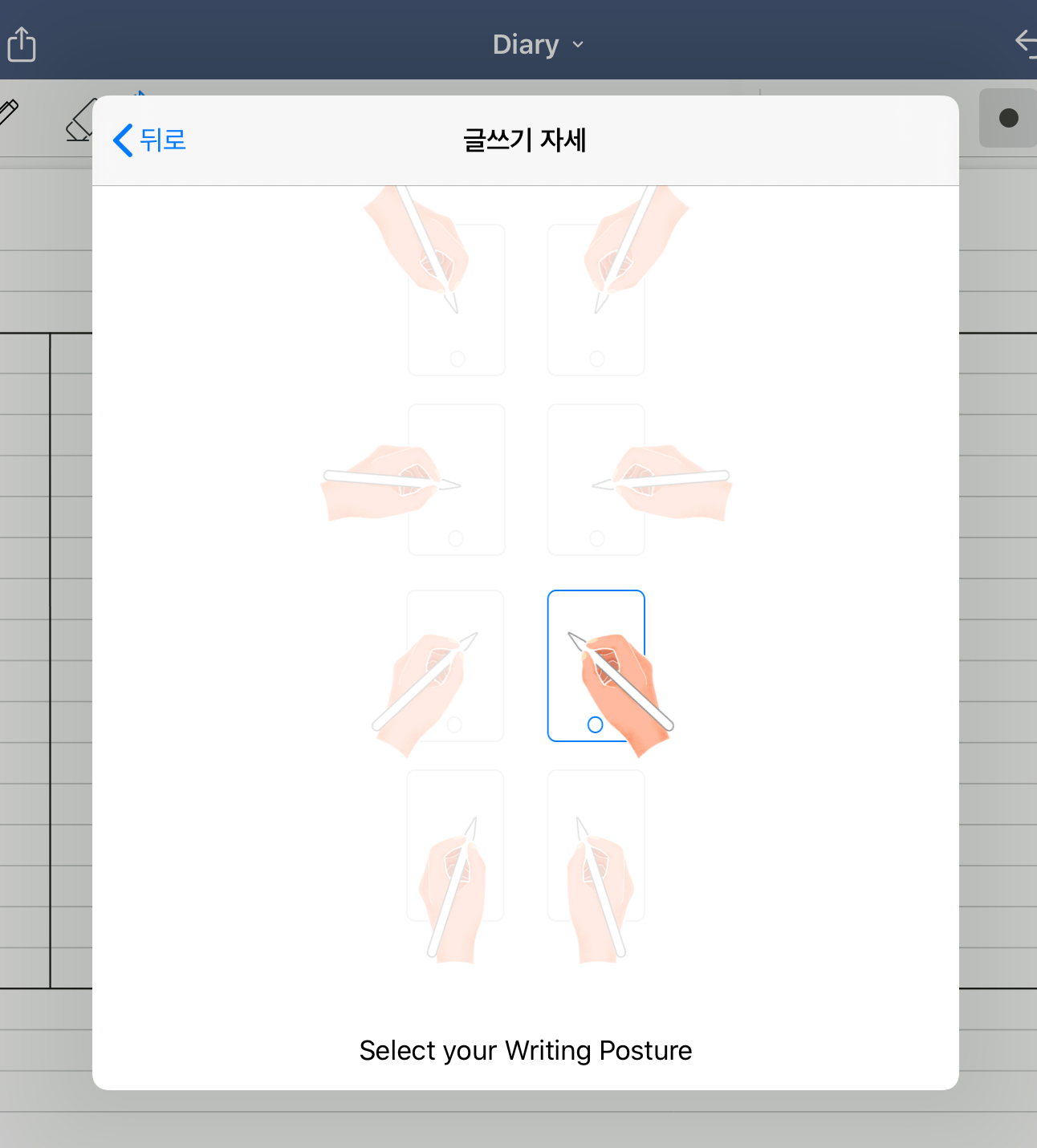 그다음은 글쓰기 자세 설정입니다. 저는 기본형으로 글씨를 쓰는 타입이라서 이렇게 설정해 놓았지만, 글씨 쓰는 자세가 다르거나 왼손잡이인 분들은 본인이 쓰는 자세의 모습을 변경해주시면 손바닥 인식 방지가 더 잘 된다고 합니다.