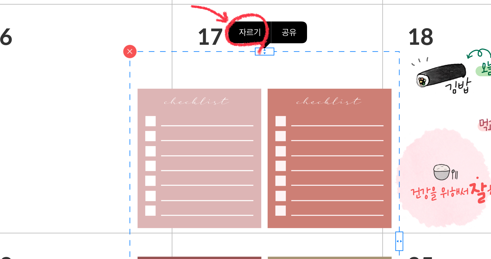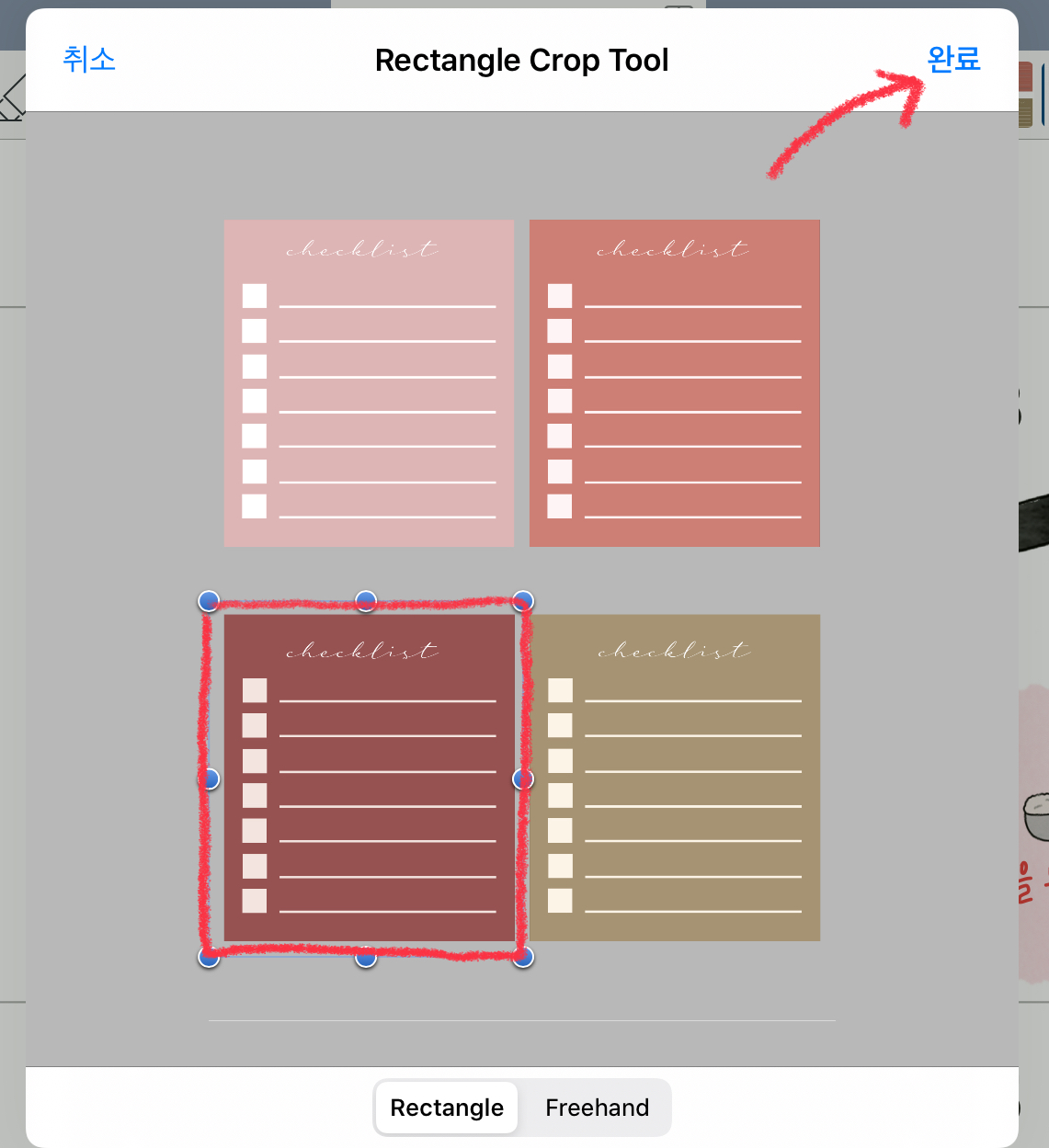 원하는 만큼의 크기로 스티커를 자른 뒤 [완료]버튼을 눌러줍니다.