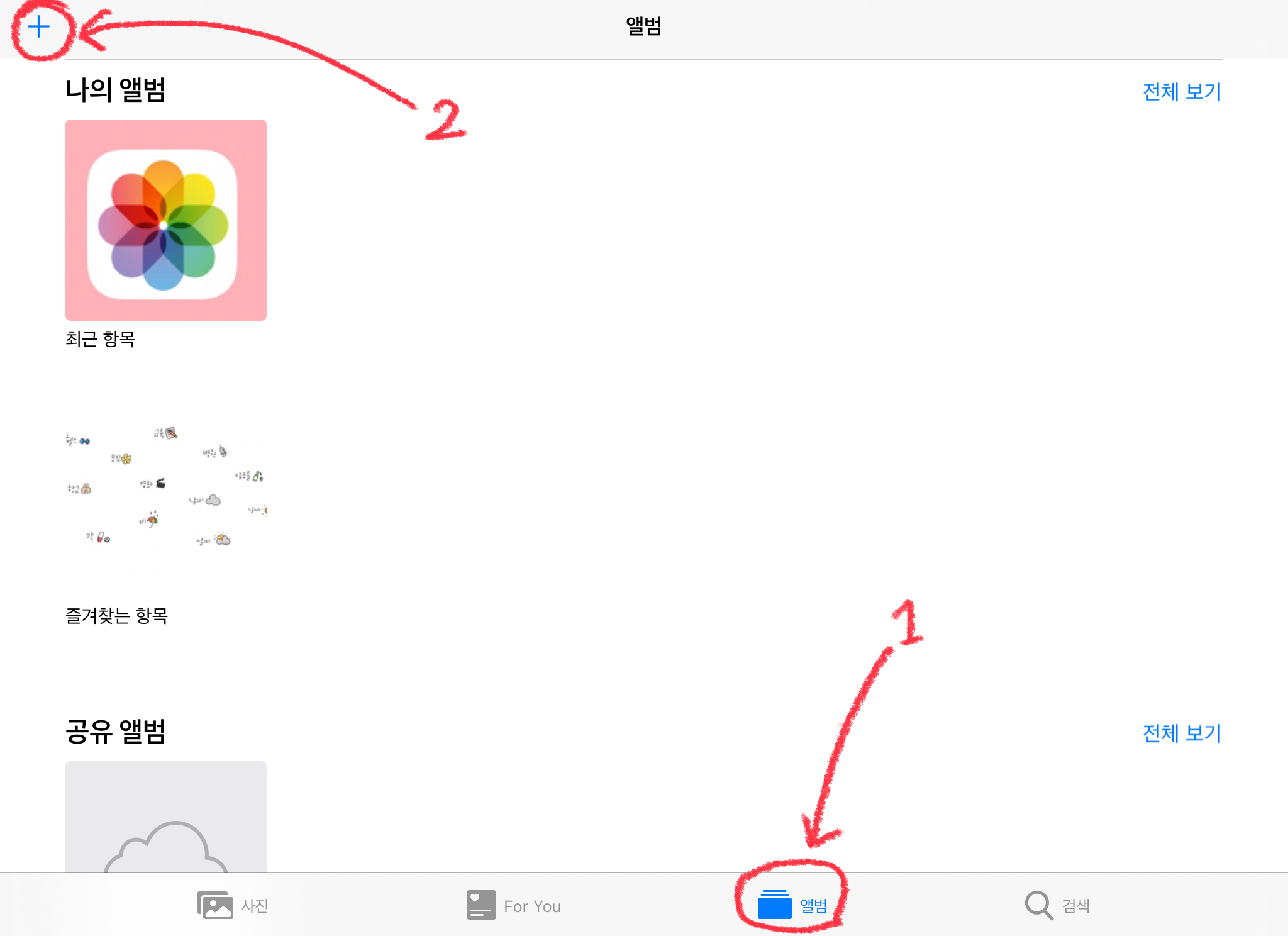 새로운 나의 앨범을 만들어 주어야 합니다. 하단의 [앨범]을 누른 뒤 왼쪽 상단의 [+]버튼을 눌러주세요.
