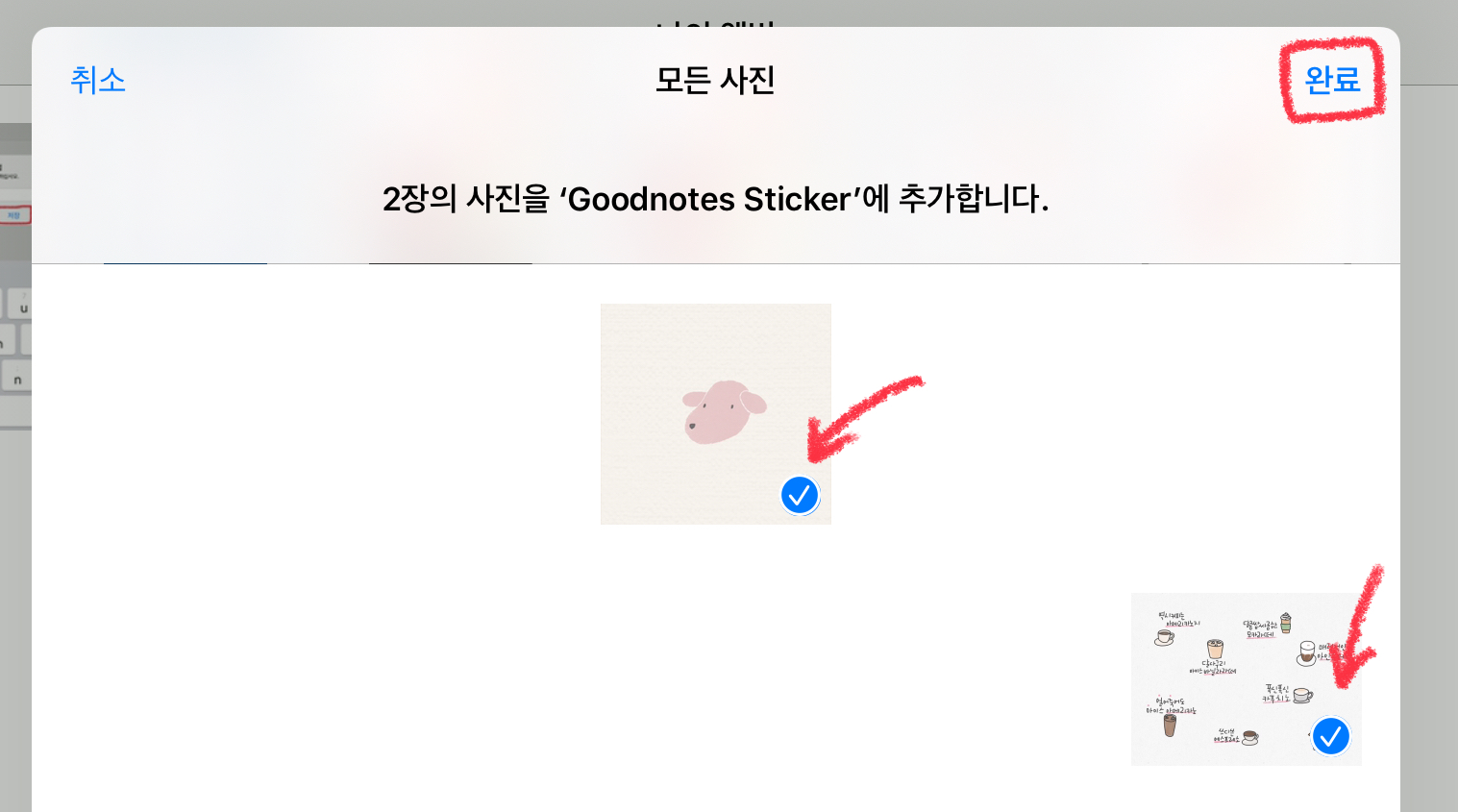 저장 버튼을 누르고 나면, 앨범에 추가 할 사진들을 고를 차례입니다. (나중에 앨범에 다시 넣을 수 있으니 스티커 전부를 선택하지 않아도 됩니다) 앨범에 넣을 스티커를 선택한 뒤 [완료] 버튼을 눌러주세요.