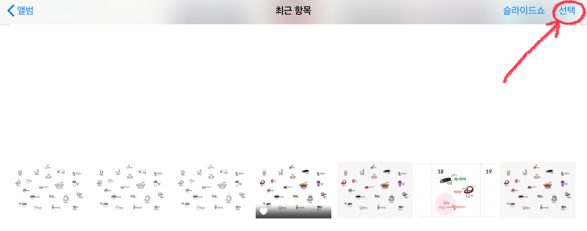 새로운 스티커를 이미지 저장한뒤 앨범에 넣는 방법입니다. [사진첩]에 들어가서 우측 상단의 [선택] 버튼을 눌러주세요.