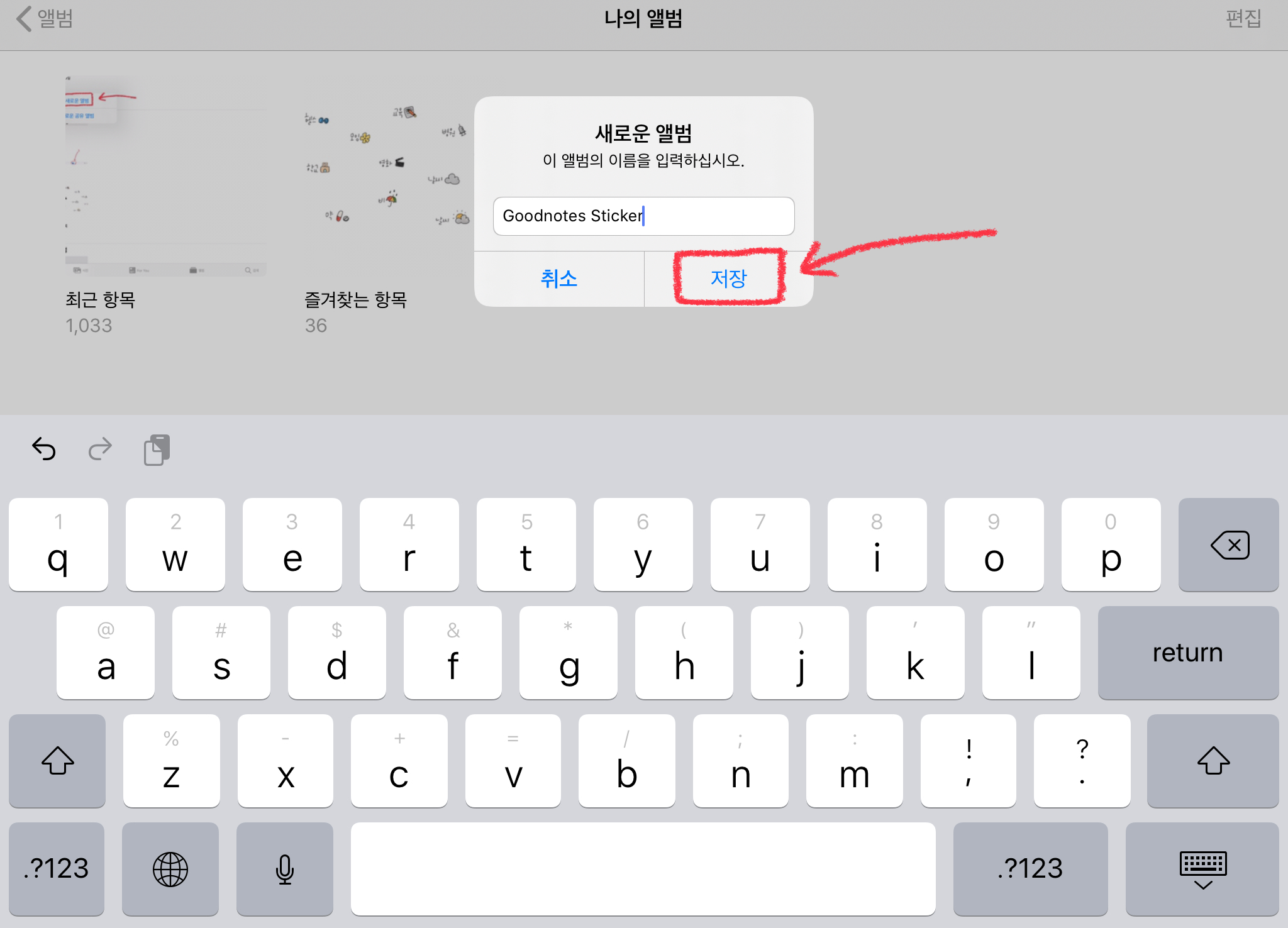 여러분들이 원하는 앨범의 제목을 적어주세요. 저는 goodnotes sticker라고 제목을 적었습니다. 그리고 [저장] 버튼을 눌러주세요.