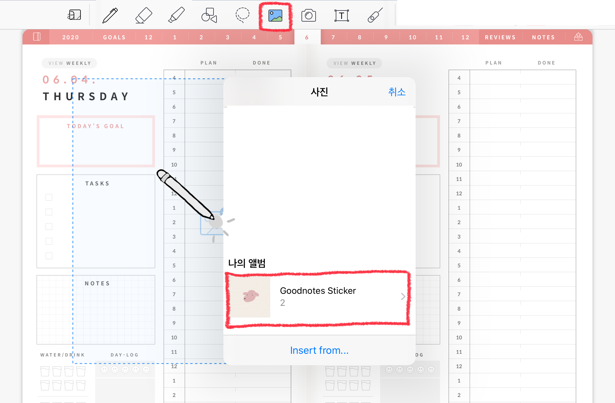 굿노트로 돌아가서 앨범을 사용해보겠습니다. [사진] 아이콘을 눌러 화면에 펜슬로 터치해주세요. 사진 앨범들이 나오는데 나의 앨범은 가장 하단에 나온답니다. 거기서 만들어 준 굿노트 스티커 앨범을 선택합니다.