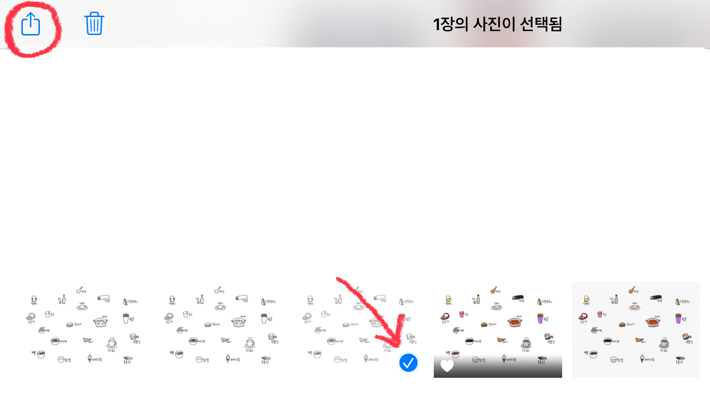 앨범에 넣어 줄 스티커를 선택한 뒤 왼쪽 상단의 [공유] 버튼을 눌러줍니다.