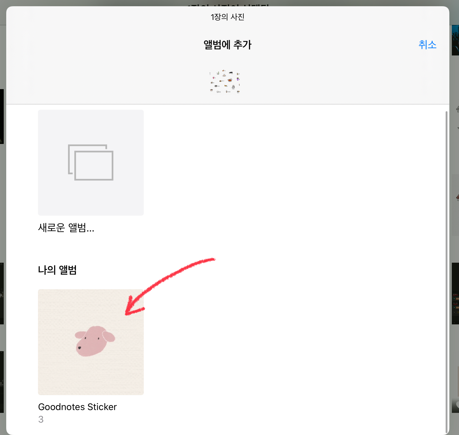 만들어 두었던 앨범을 선택하면, 스티커가 앨범에 추가가 됩니다.