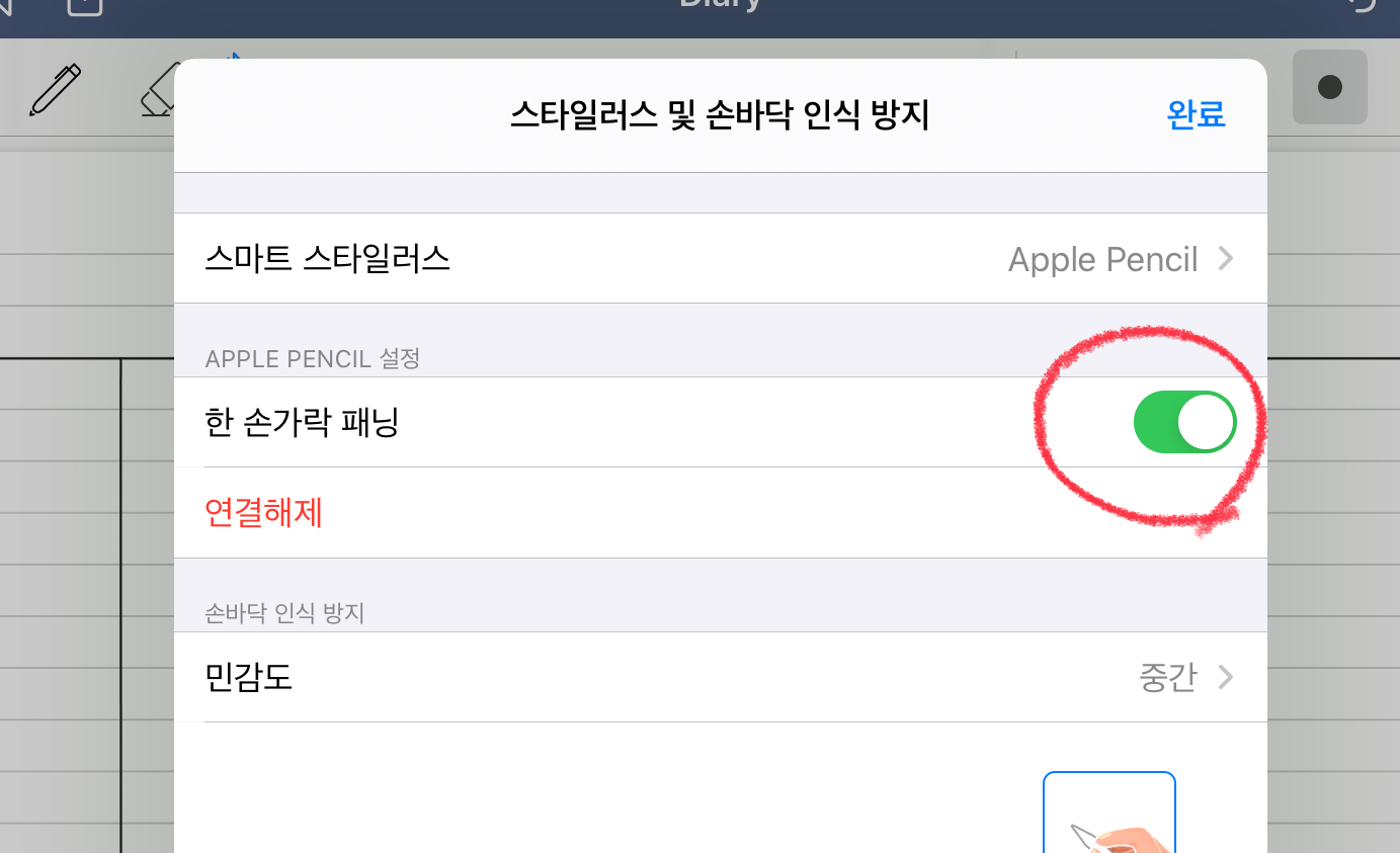 굿노트로 돌아가 보겠습니다. 굿노트를 켜주신 후 볼펜 혹은 지우개 혹은 하이라이터 등을 눌러주면, [스타일러스 및 손바닥 인식 방지] 메뉴가 보입니다. 그 메뉴를 터치하면 아래와 같은 화면이 나옵니다.