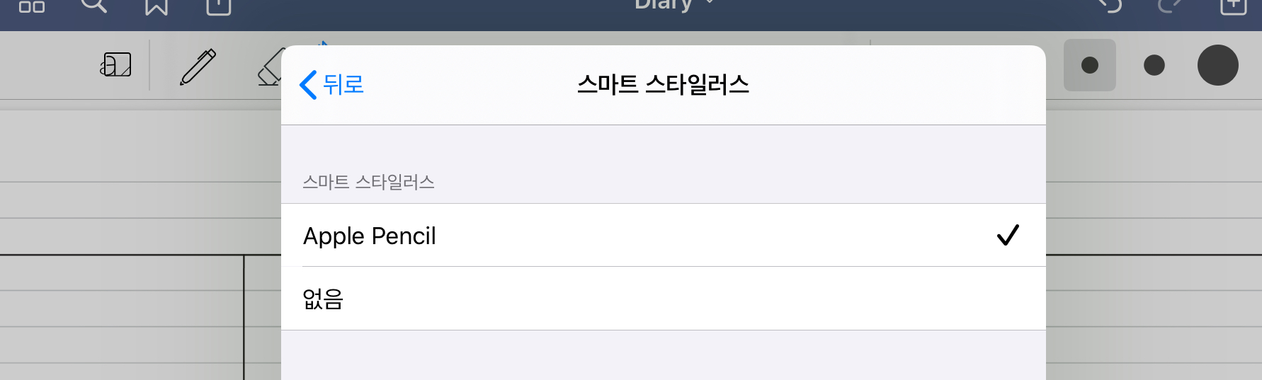스마트 스타일러스에서 [없음]으로 할 경우에는 아래와 같은 화면이 나타나지 않습니다. 팬슬을 이용할 경우에는 반드시 체크를 해주세요.