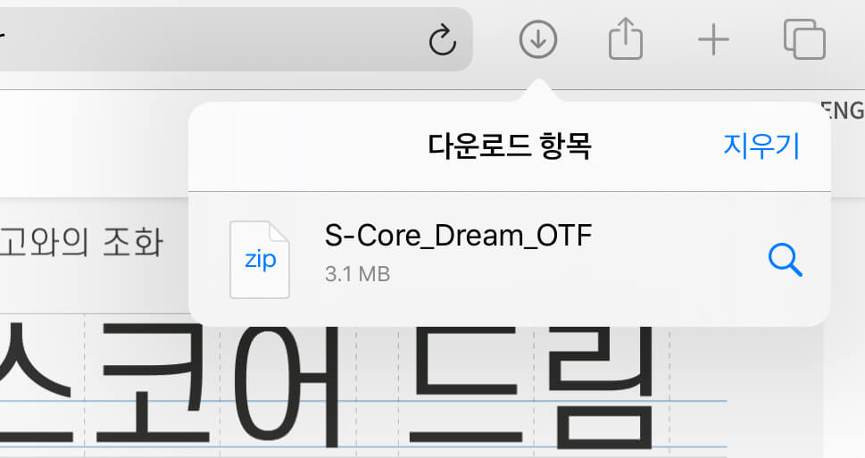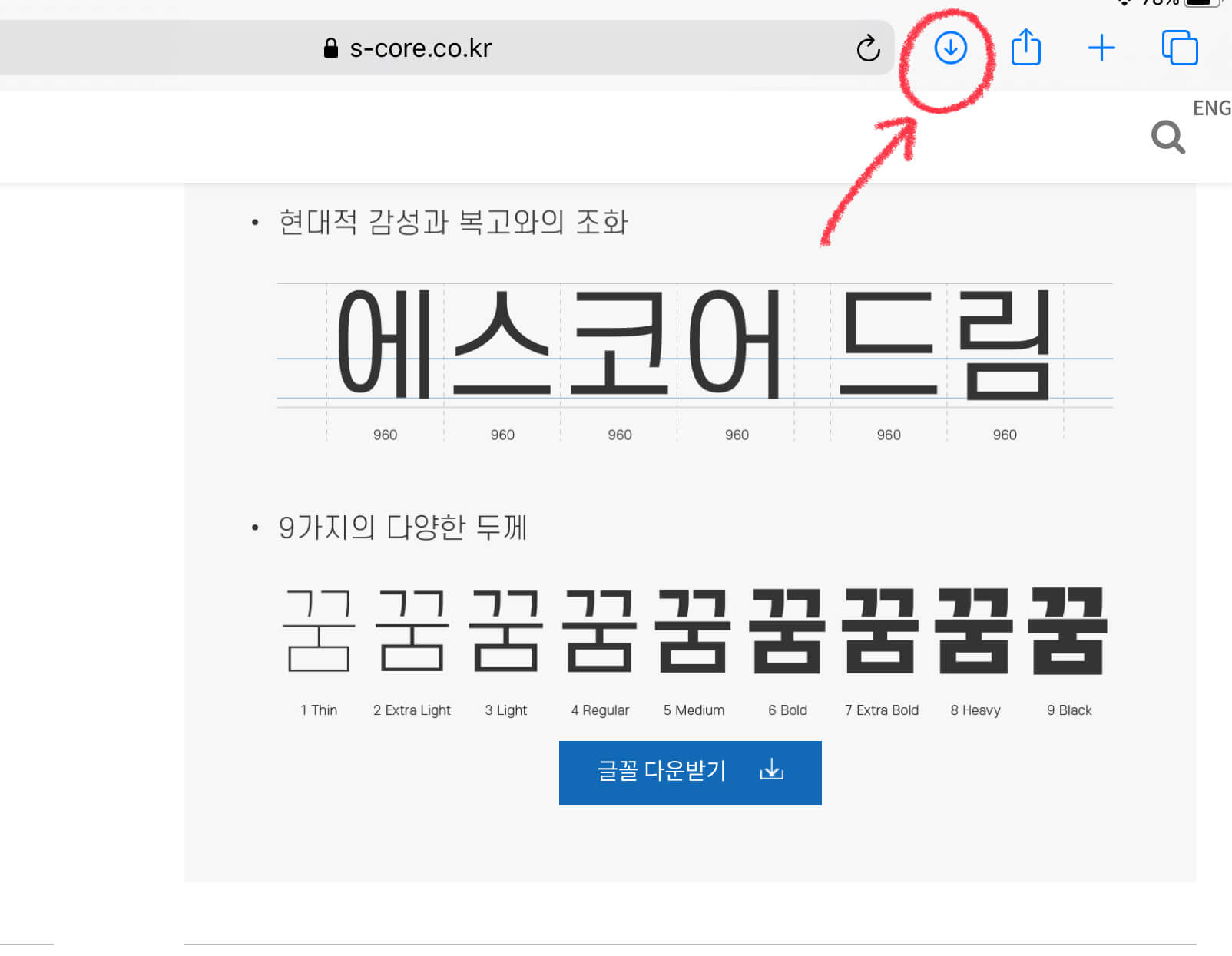 제가 설치할 폰트는 상업용 무료 폰트인 [에스코어드림체] 입니다. 깔끔하고 굵기가 다양해서 제목부터 본문까지 다양하게 활용할 수 있습니다. 아이패드 Safari (인터넷 창)에서 아래 페이지에 접속을 합니다. '에스코어 글꼴'이라고 검색을 해도 됩니다.