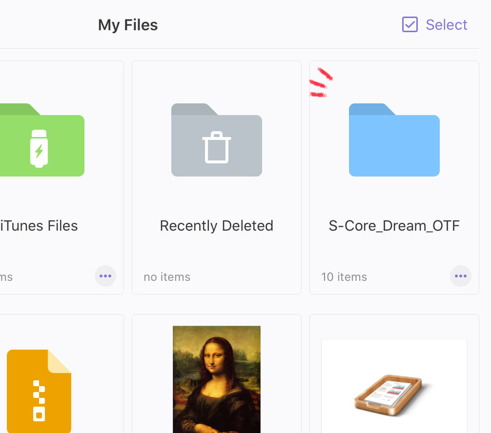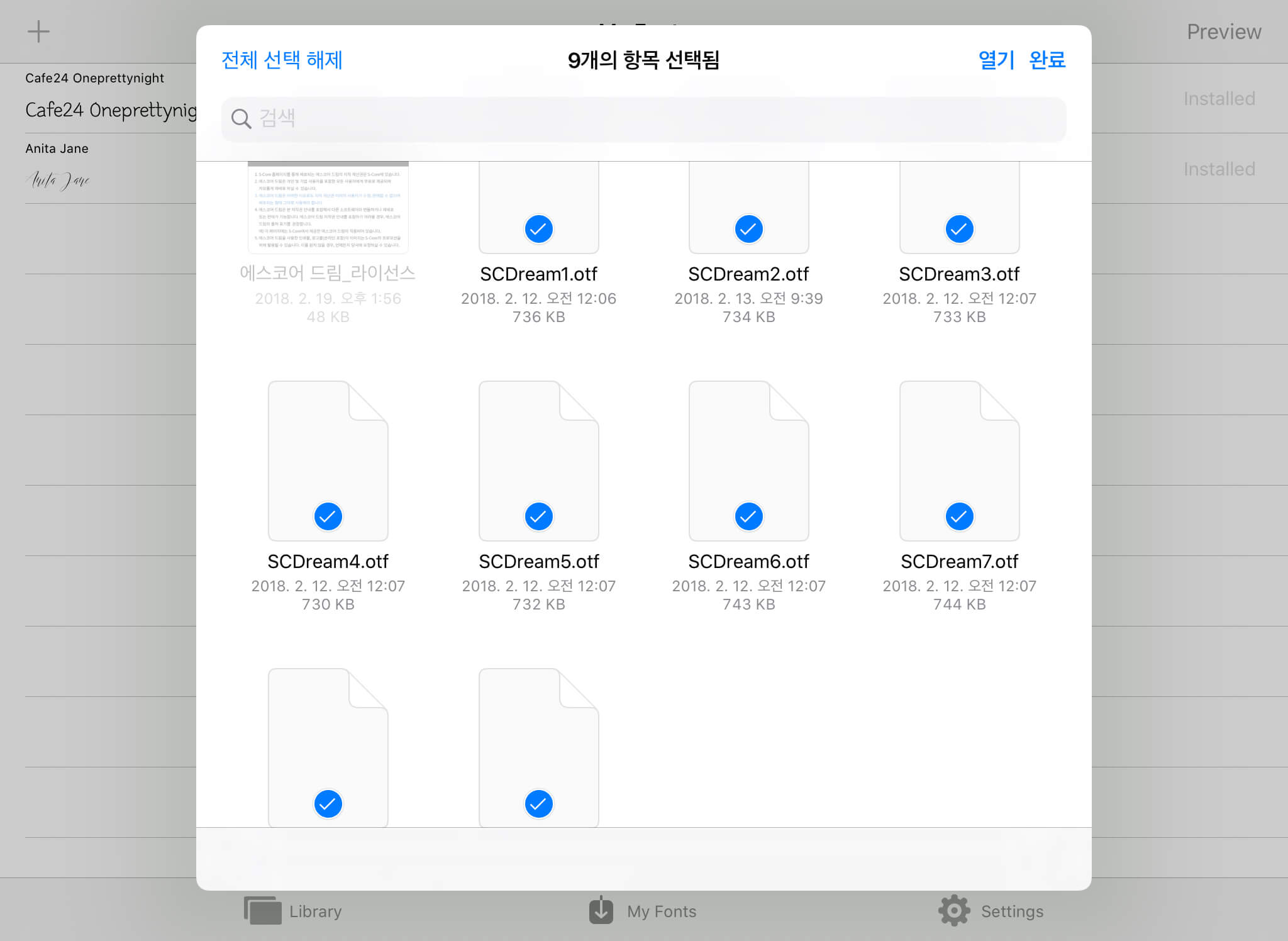 아래와 같은 화면이 뜨는데, 내가 설치할 폰트 파일을 지정해줘야 합니다. 바로 파일이 보이면 바로 선택을 해주면 됩니다. 우리는 Documents 어플을 이용해서 압축을 풀어주었으니, Documents 에서 파일을 지정해주어야 합니다.