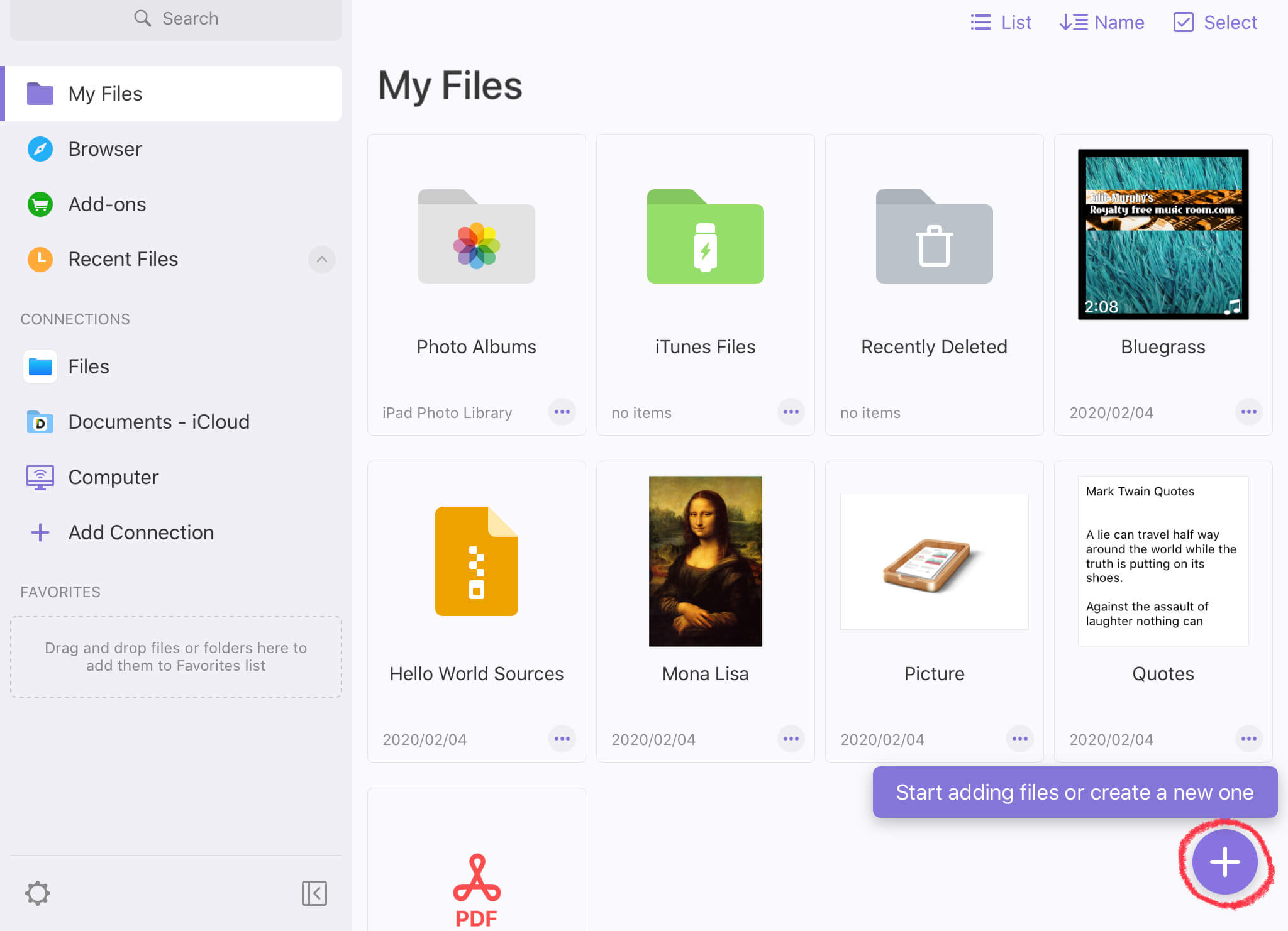 이제 아까 준비했던 첫 번째 어플을 사용할 차례입니다. 바로 [Documents] 어플을 이용해서 압축파일을 열어줄 예정입니다. 어플을 열면 아래와 같은 화면이 나옵니다. 여기에 우측 하단에 있는 [+]버튼을 눌러 다운로드 한 폰트 압축파일을 열어줍니다.