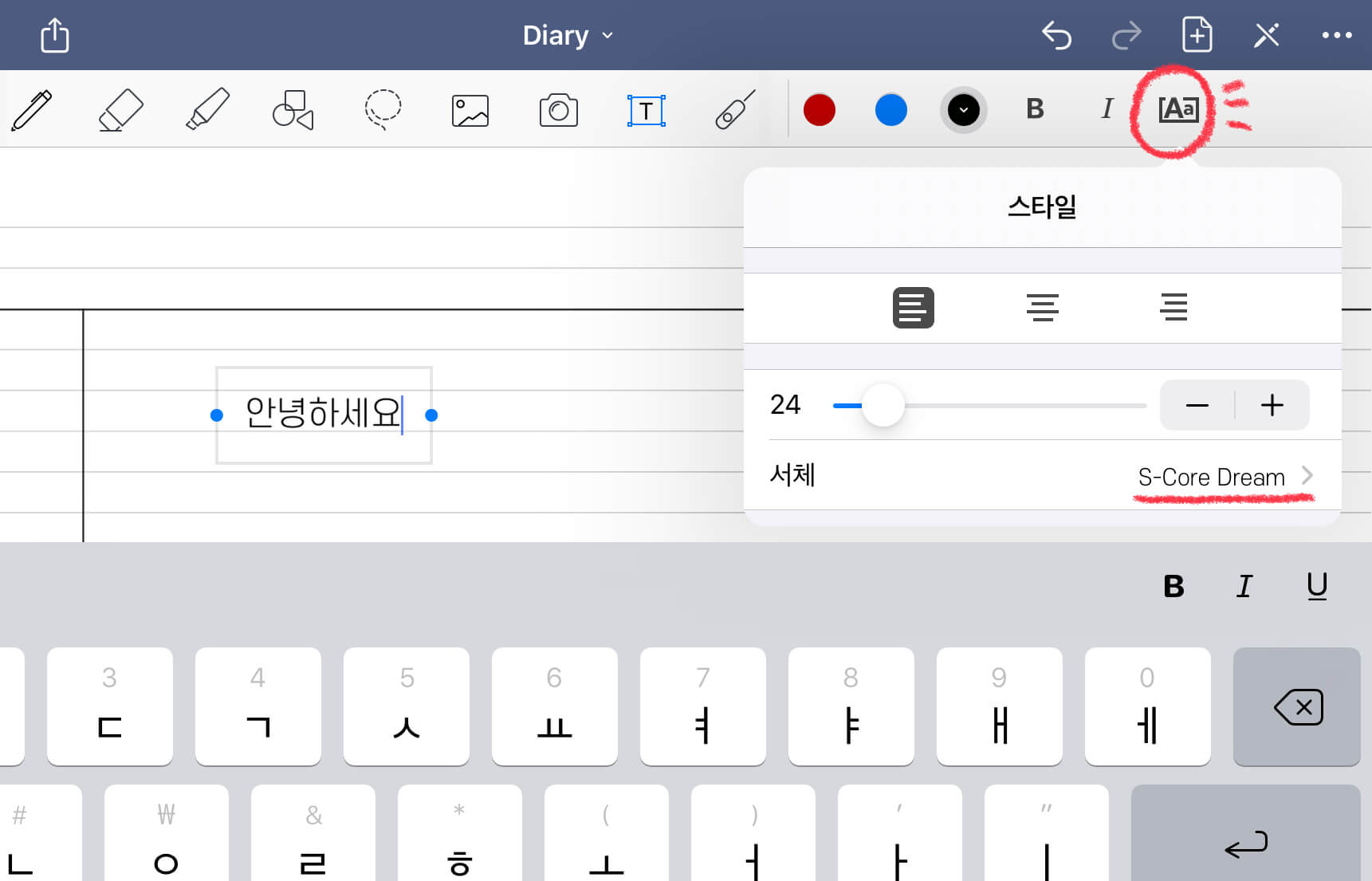 굿노트5에 들어가서 텍스트 도구를 열어줍니다. 아래와 같이 [Aa]를 클릭하면 폰트를 바꿀 수 있습니다.