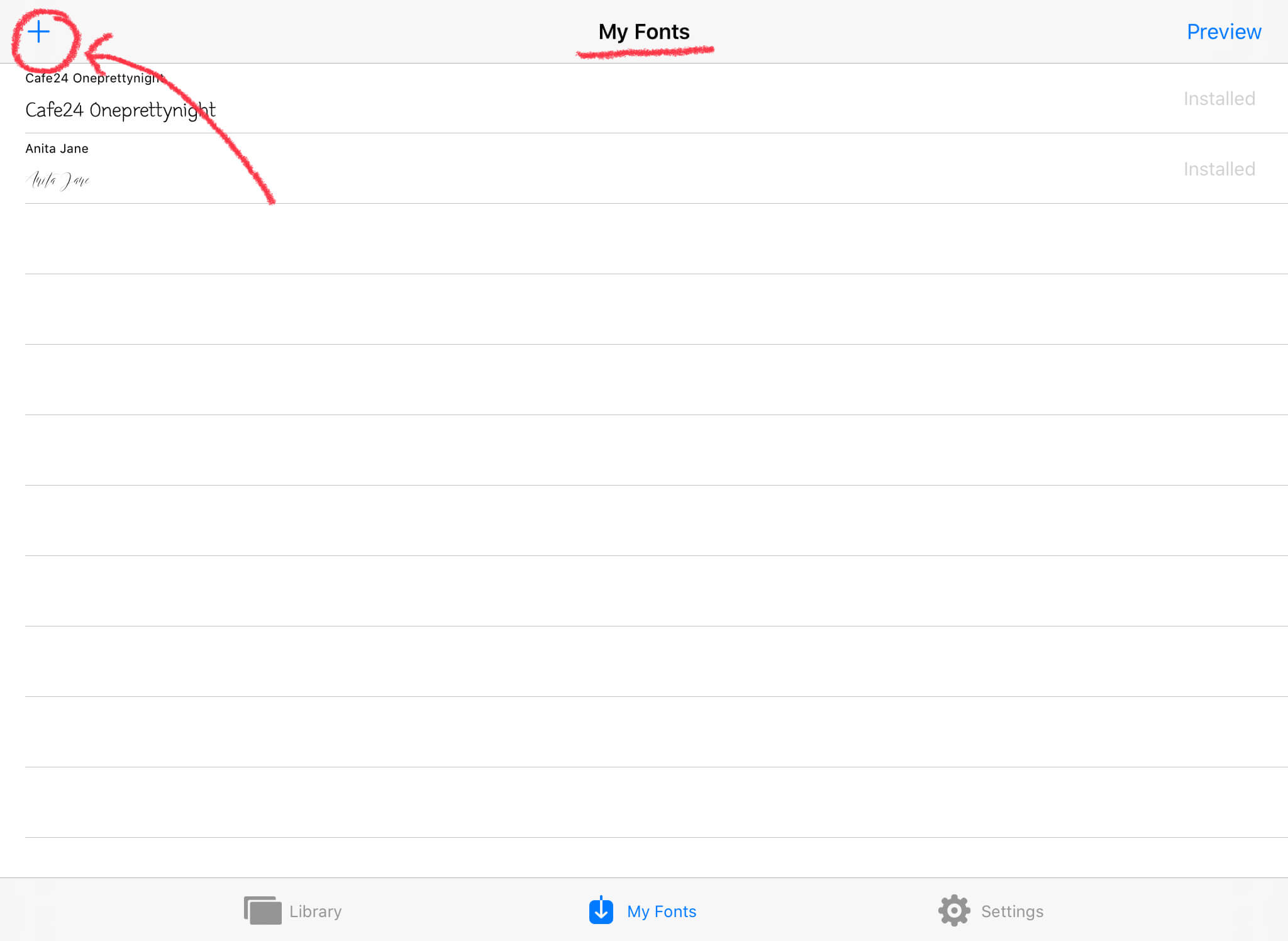 어플을 열어주면 아래와 같은 화면이 뜨는데, My Fonts 항목을 클릭 한 다음에 [+]버튼을 눌러줍니다.