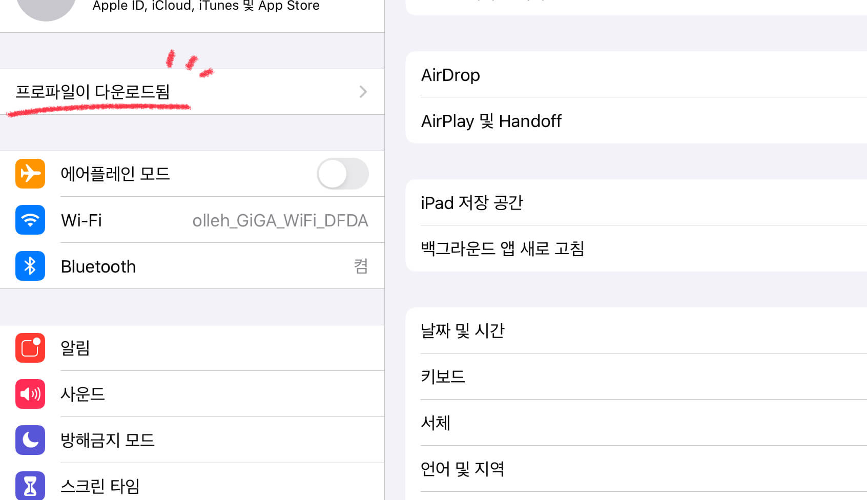 아래와 같이 '프로파일이 다운로드됨'이라는 못 보던 항목이 새로 생겼습니다.