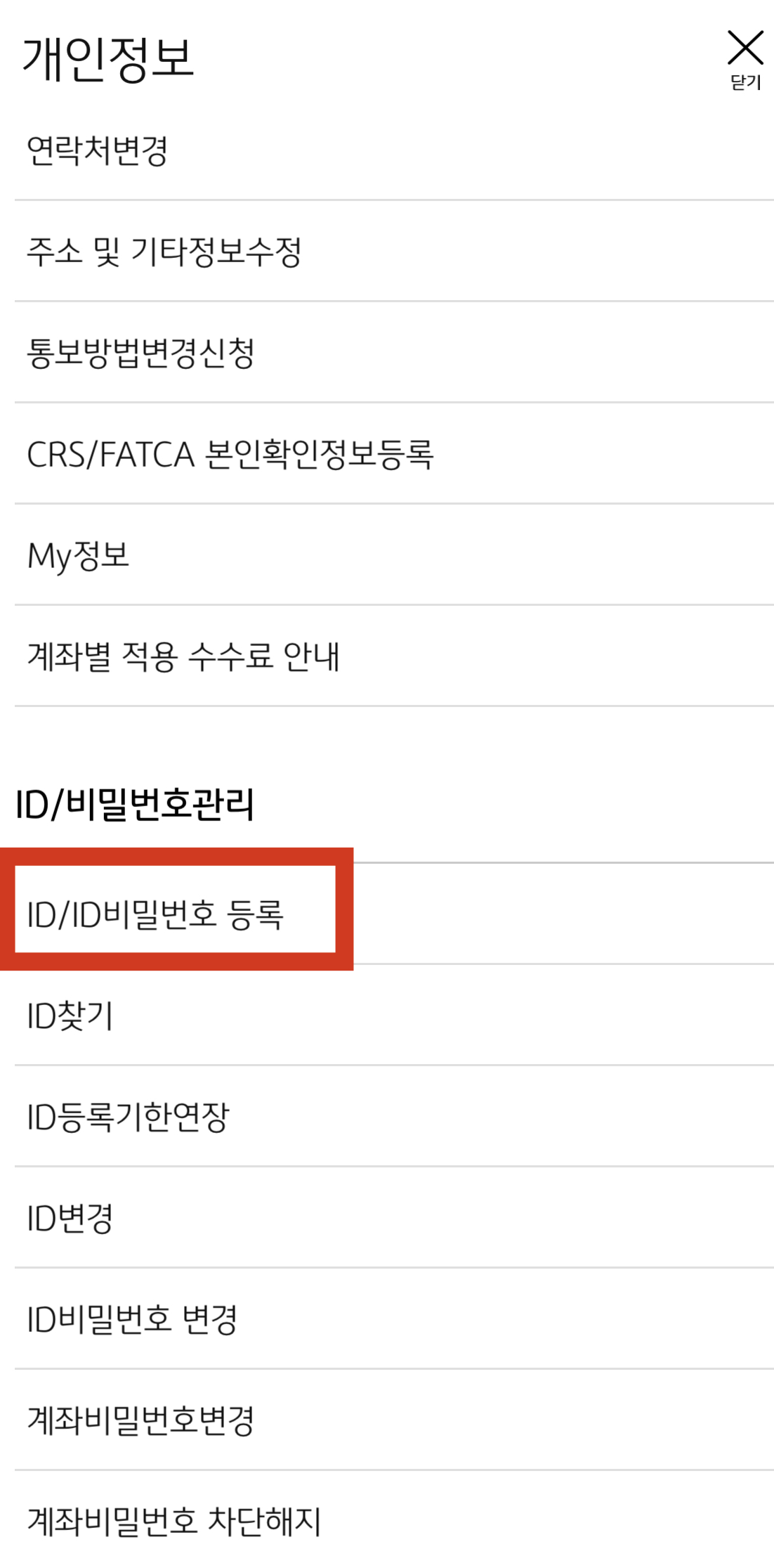 하단에 있는 [개인정보] 에 들어간 뒤 [ID/ID비밀번호 등록]을 선택합니다.
