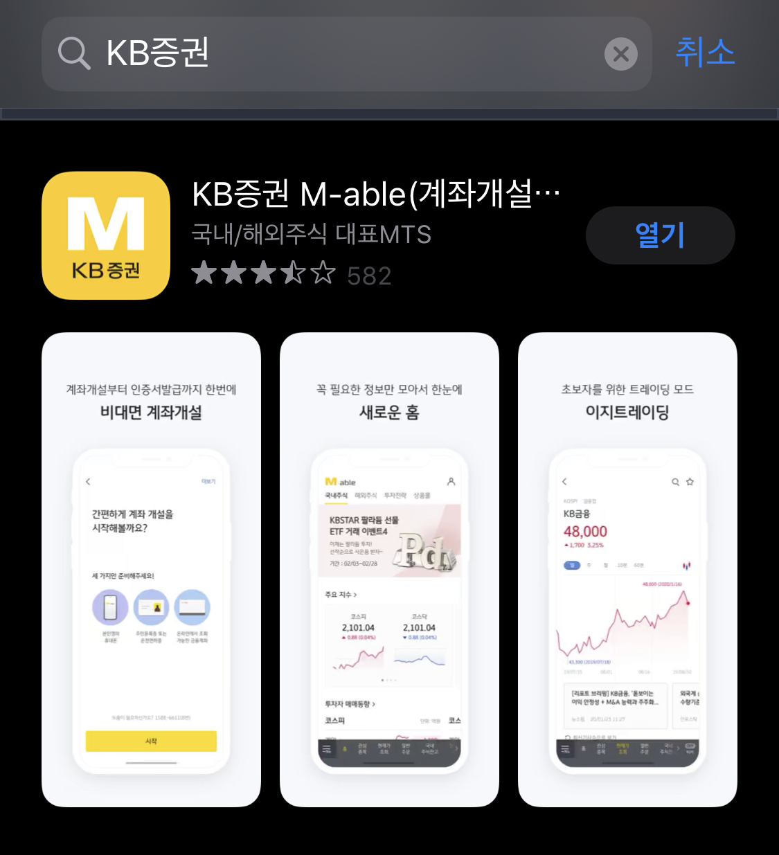 앱스토어 혹은 플레이스토어에서 [KB 증권]을 검색하거나, KB증권 홈페이지에서 비대면 계좌개설 버튼을 눌러 본인 핸드폰으로 어플 링크를 받습니다.