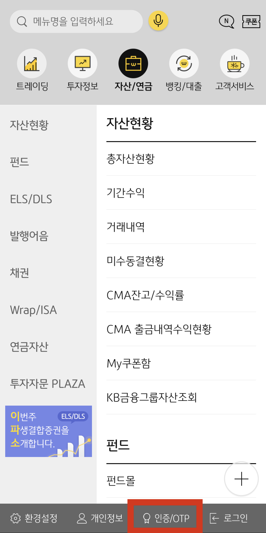 마지막 증권용 공인인증서 발급단계 입니다. 증권용 공인인증서는 금융거래용 공인인증서와 다르기 때문에 새롭게 발급을 받아야 합니다. 하단에 있는 [인증/OTP]메뉴에 들어간 뒤 [인증서(재)발급]을 선택합니다.