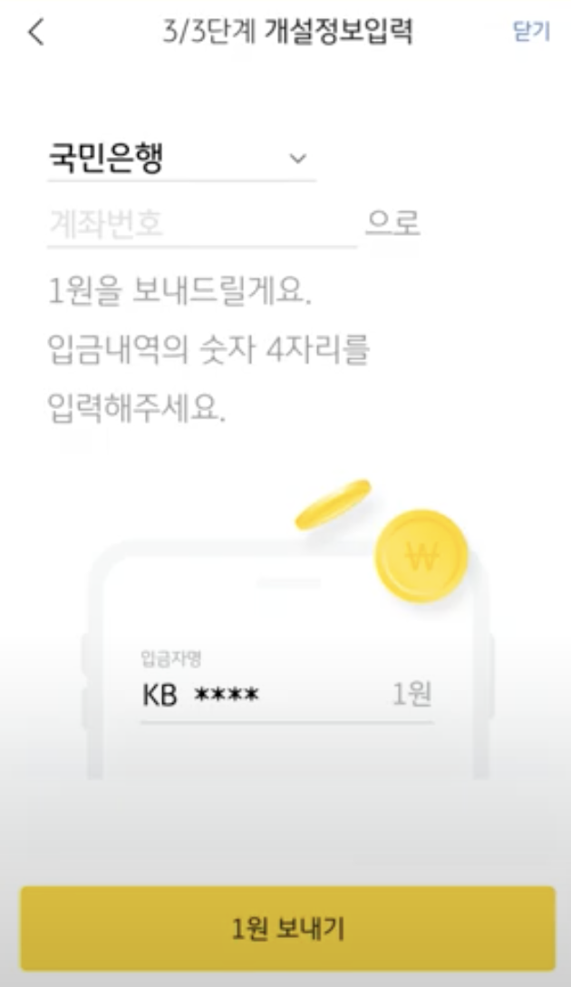 본인이 가지고 있는 계좌 정보를 입력하면 그 계좌로 1원을 입금해줍니다. 그때 입금내역의 숫자 4자리를 입력해줍니다. (타 은행도 가능합니다.)