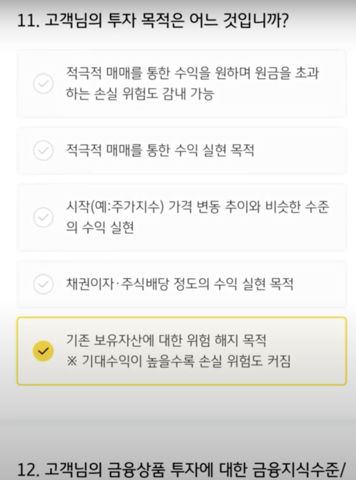 설문조사처럼 느껴지는 투자자 정보를 입력합니다. 본인에게 맞는 내용을 선택하면 됩니다. :)