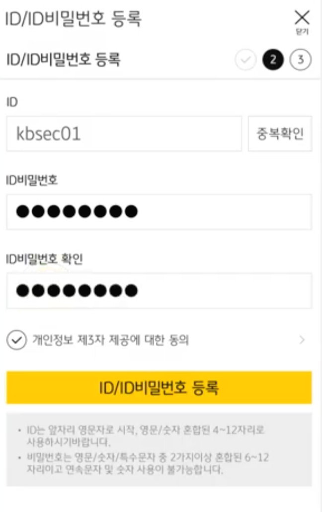 KB증권 어플에 로그인할 아이디와 비밀번호를 등록합니다.