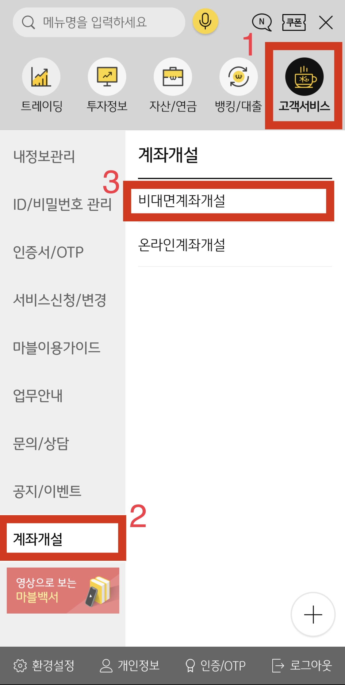 M-able(KB증권) 어플리케이션에 들어가서 [1.고객서비스] - [2.계좌개설] - [3.비대면계좌개설] 을 선택합니다.