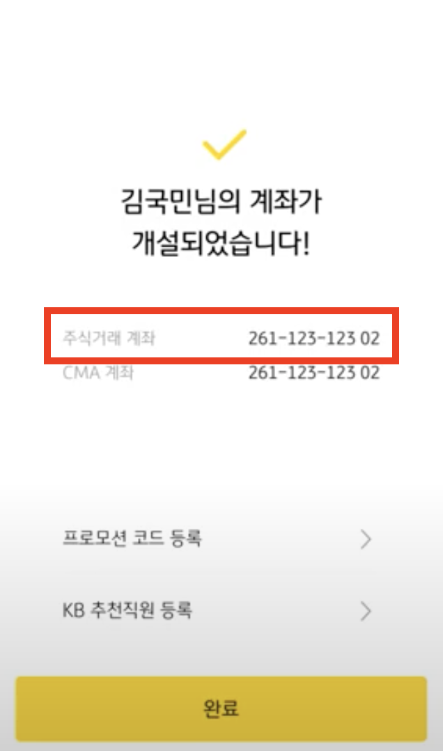 이렇게 증권 계좌가 개설되었습니다. :) 1단계 완료입니다. 여기서 중요한 것은 아래처럼 주식 거래 계좌 번호를 꼭 메모해두세요.
