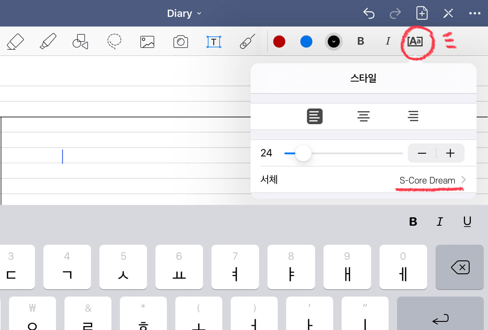 굿노트5에 들어가서 텍스트 도구를 열어줍니다. 아래와 같이 [Aa]를 클릭하면 폰트를 바꿀 수 있습니다.