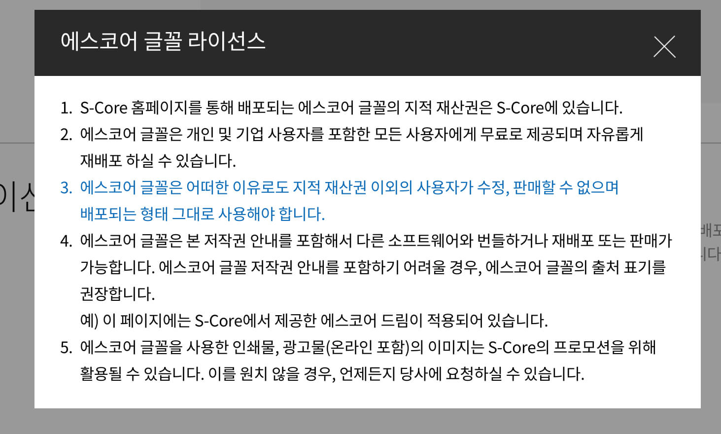 에스코어 글꼴 라이선스는 아래와 같습니다. 개인 및 기업 사용자를 포함한 모든 사용자에게 무료로 제공됩니다.
