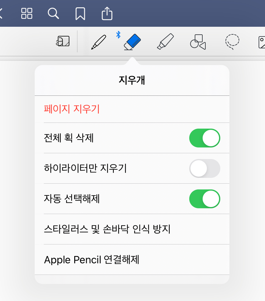 가장 유용하게 사용하고 있는 항목이라서, 여러분들에게 추천하는 설정입니다. 지우개로 지운 후, 다시 펜 도구를 선택해주어야 하는 수고를 덜어주는 설정입니다. [자동 선택 해제] 설정을 해주게 되면, 지우개를 지우고 난 후에 자동으로 바로 직전 도구로 변합니다. 빠르게 글을 적을 때 아주 유용한 도구입니다.
