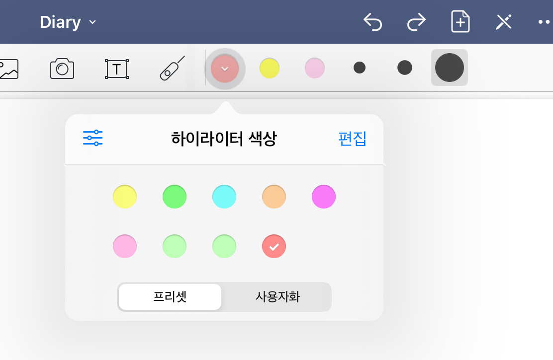 하이라이터도 펜 도구와 같이 색상이 변경 가능합니다. 프리셋이 주로 형광펜 색상으로 되어 있습니다. 아래 오른쪽 사진과 같이 [사용자화] 항목에 들어가서 원하는 색상으로 프리셋 해놓을 수도 있습니다.