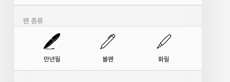 맨 왼쪽에 보시는 것과 같이 만년필은 제가 가장 많이 사용하는 펜입니다. 실제 만년필과 비슷하게 끝이 뾰족하게 나오고, 압력을 이용해서 적당 하게 굵기 조절이 가능하여 자연스러운 글씨를 쓸 수 있습니다.
