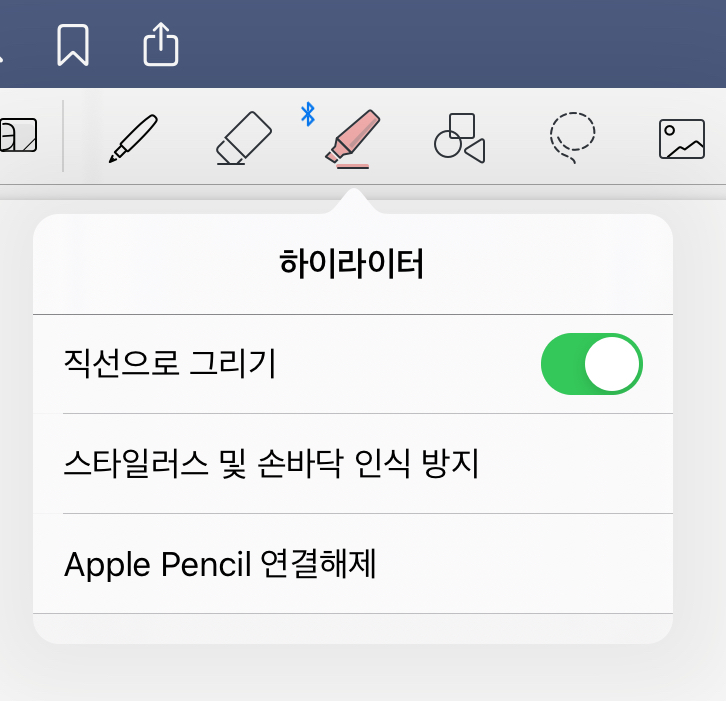 형광펜 도구입니다. 다이어리에 기간을 표시할 때도 쓰이고, 중요한 필기에 밑줄을 그을 때도 사용하는 도구입니다. 아무래도 직선으로 그어야 할 일이 많기 때문에 아래와 같이 [직선으로 그리기]를 설정한 채 이용하고 있습니다.