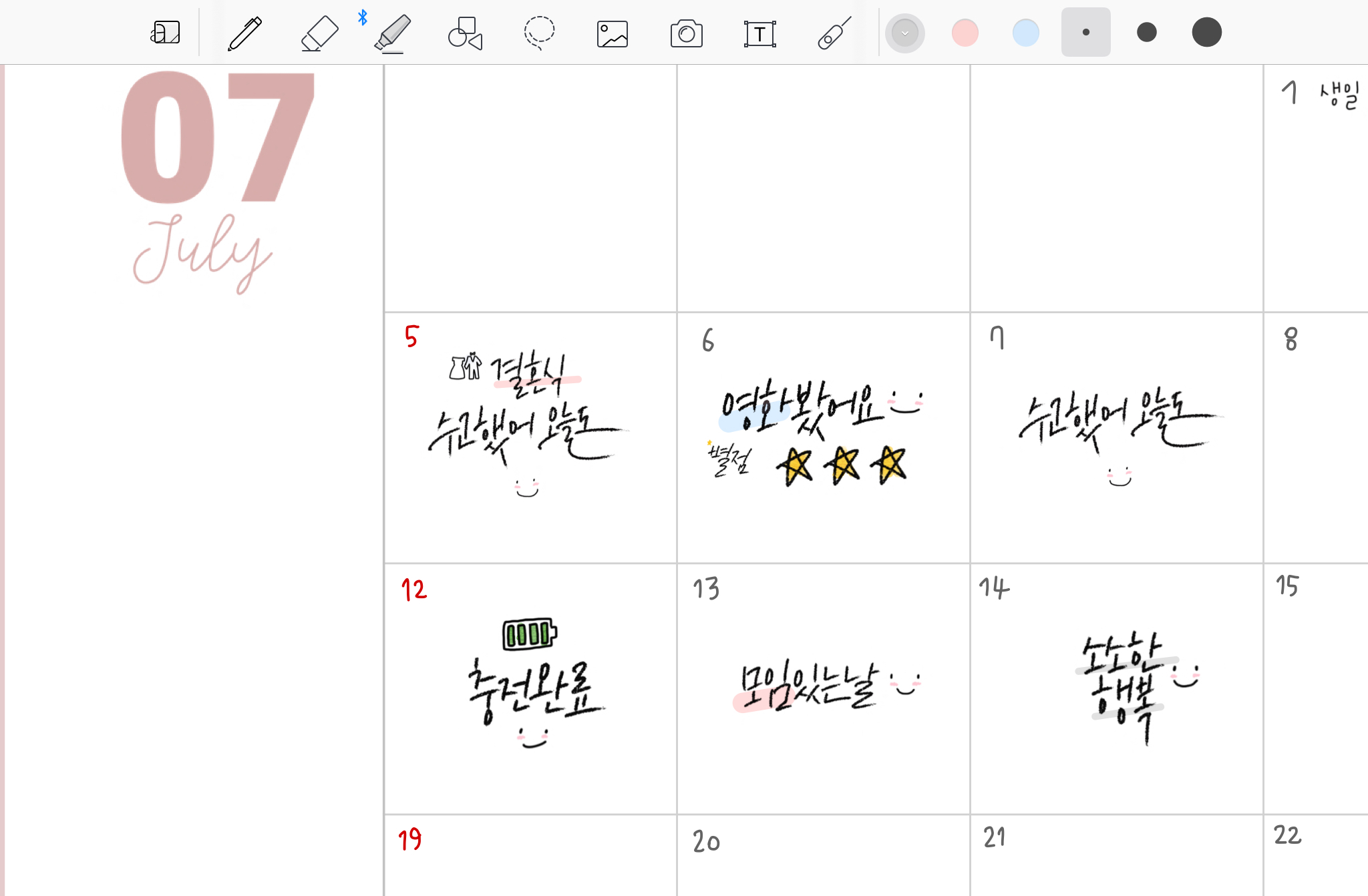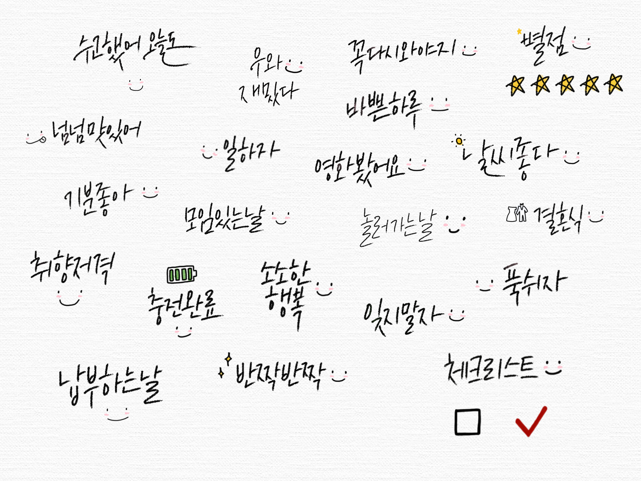 아이패드 굿노트에서 다이어리 꾸밀때에는 '아 이런 말도 있으면 좋겠다' 싶은 생각이 자주 드는데, 막상 글씨를 쓰다보면 생각이 안나네요. 이제부터는 생각날때마다 메모를 해야겠습니다 :)