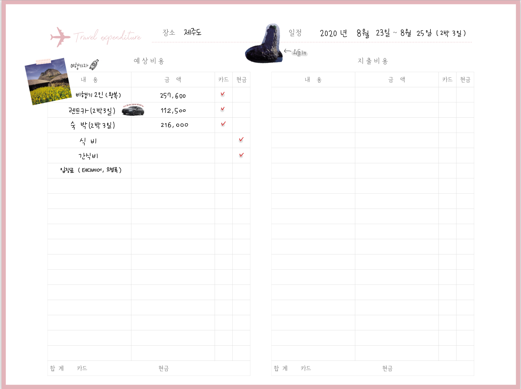 일단 장소와 일정을 상단에 적습니다. 그리고 여행 예상 비용을 왼쪽에 적어주세요. 여행을 다녀온 후에는 오른쪽 실제 지출비용을 적어주면 됩니다. 여행지의 사진들을 넣으면 더욱 예쁜 것 같습니다.