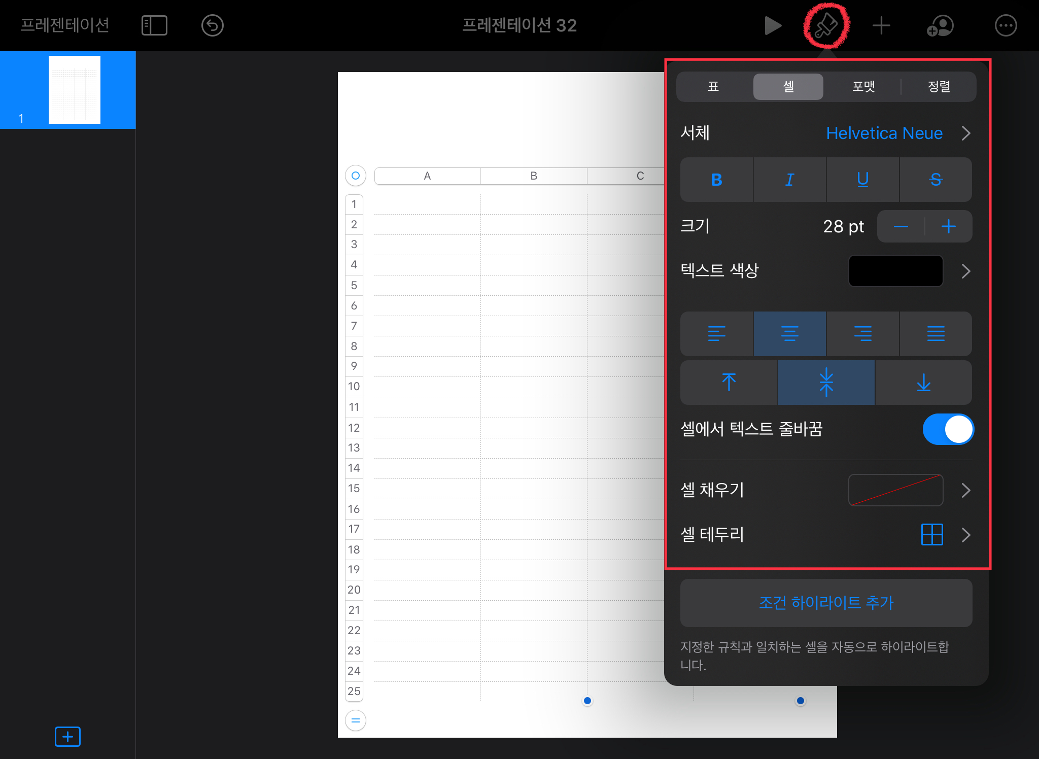 표를 꾸미는 방법은 오른쪽 상단의 [붓] 버튼입니다. [붓] - [셀]에 들어가면 폰트, 크기, 테두리 등을 마음껏 꾸밀 수 있습니다.