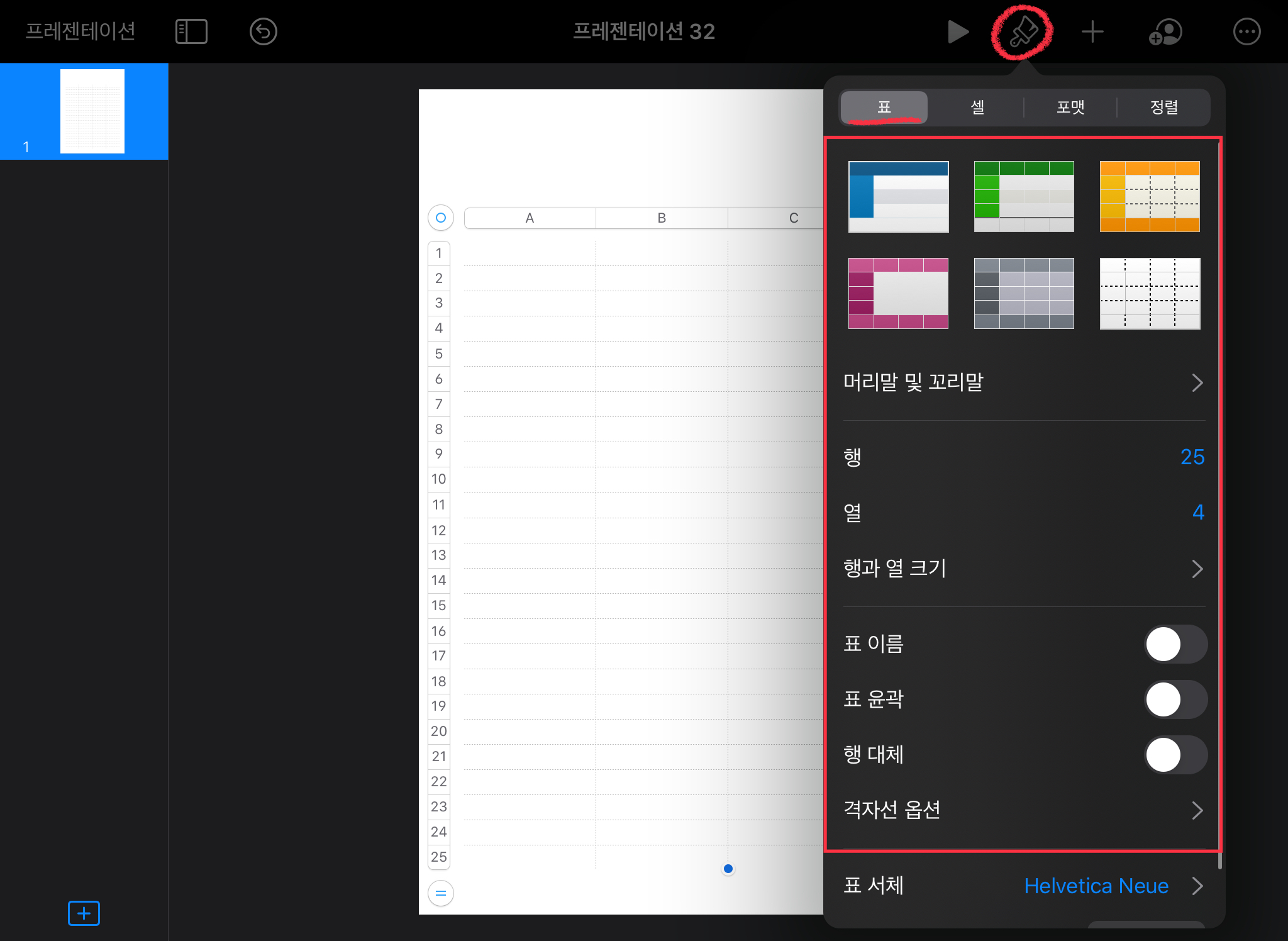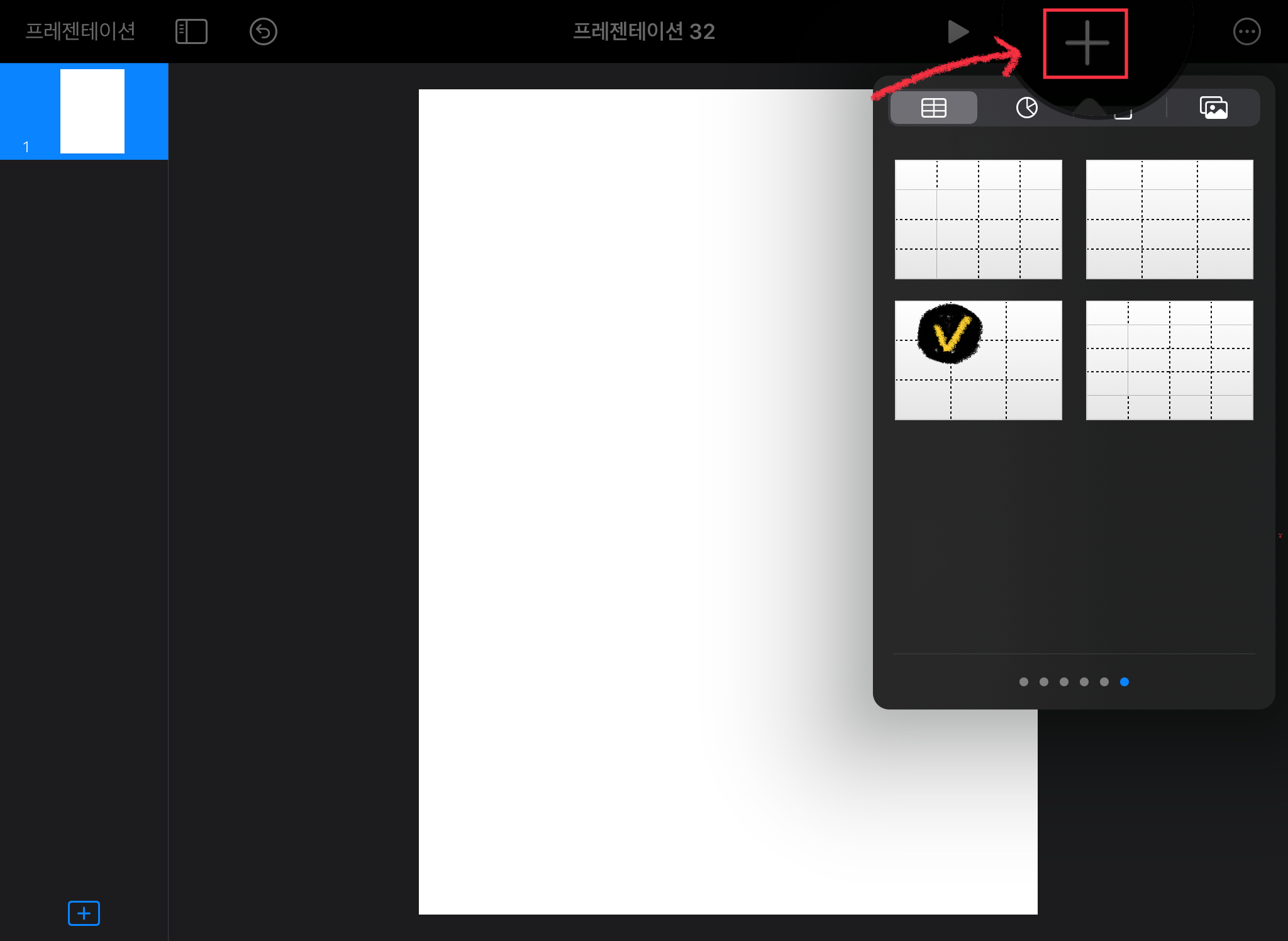 키노트 오른쪽 상단에 있는 + 버튼을 눌러서 표를 삽입해주세요. (테두리 색상과 스타일 모두 변경 가능합니다)