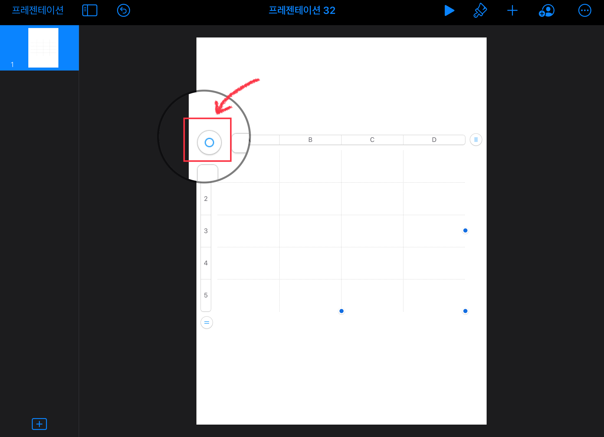 표의 크기를 넓혀주고 싶다면, 표를 선택한 뒤 파란색 점을 이용해서 크기를 늘려주세요.
