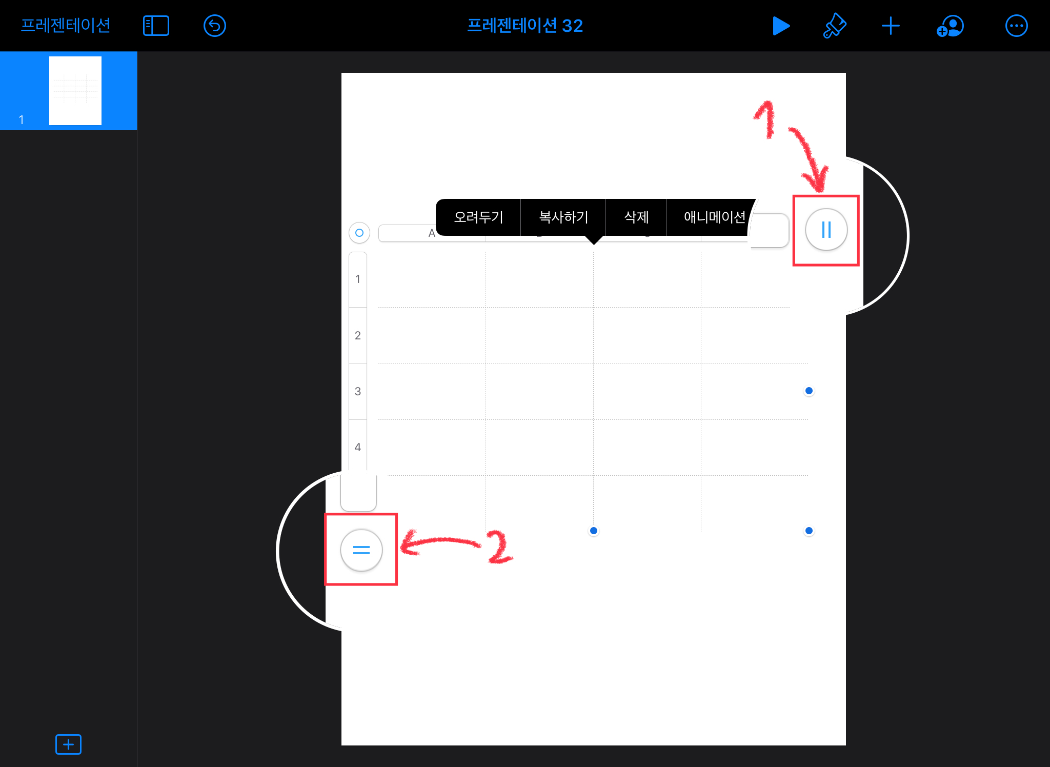 키노트 오른쪽 상단에 있는 + 버튼을 눌러서 표를 삽입해주세요. (테두리 색상과 스타일 모두 변경 가능합니다)