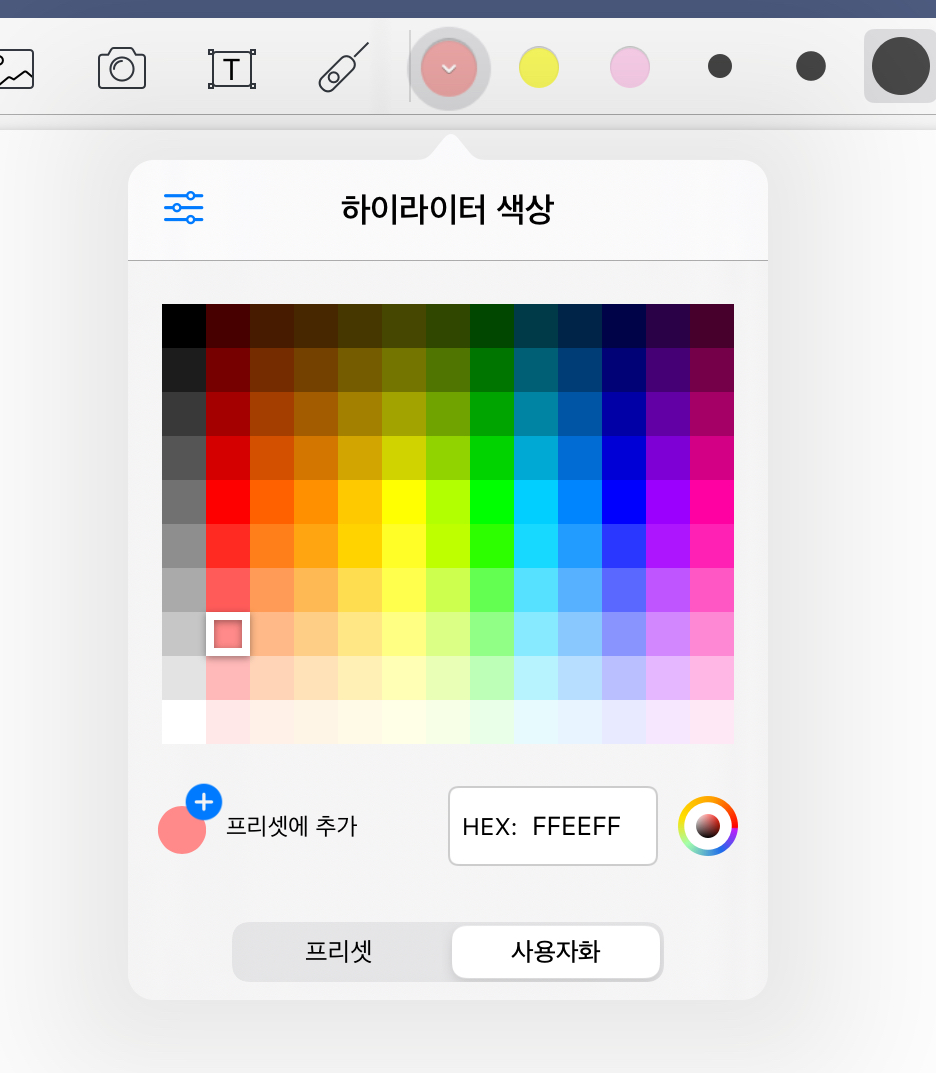 하이라이터도 펜 도구와 같이 색상이 변경 가능합니다. 프리셋이 주로 형광펜 색상으로 되어 있습니다. 아래 오른쪽 사진과 같이 [사용자화] 항목에 들어가서 원하는 색상으로 프리셋 해놓을 수도 있습니다.