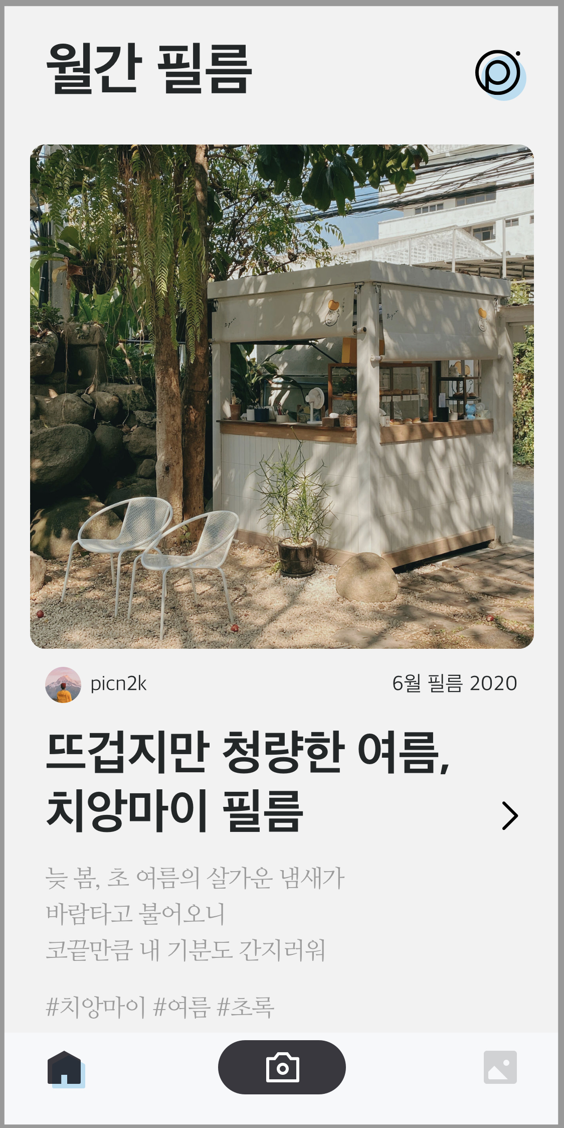 피크닉 카메라 어플의 가장 큰 장점은, 매달 제공되는 [월간] 필름이 아닐까 싶습니다. 그때그때 계절에 맞는 감성 필터를 작가님께서 올려주시기 때문에 매달 새로운 필터를 사용해볼 수 있습니다.