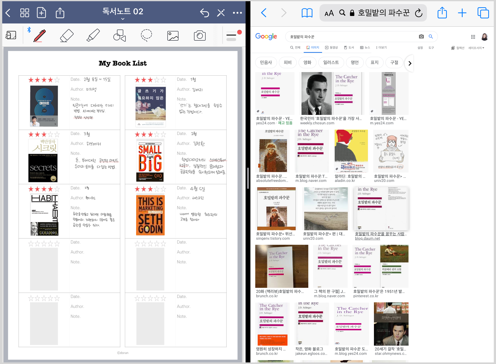 굿노트 독서노트에 책 표지를 넣고 싶은분들을 위한 Tip 입니다. 먼저 스플릿뷰를 이용해서 Safari 창을 오른쪽에 띄워주세요. (스플릿뷰 액션 방법을 알고싶은 분은 아래 링크를 참고해주세요.)