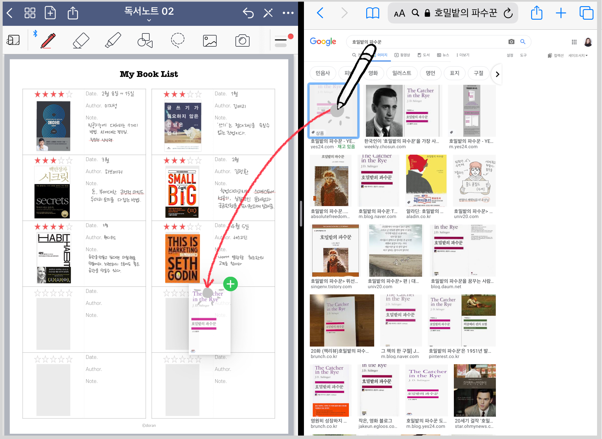 굿노트 독서노트에 책 표지를 넣고 싶은분들을 위한 Tip 입니다. 먼저 스플릿뷰를 이용해서 Safari 창을 오른쪽에 띄워주세요. (스플릿뷰 액션 방법을 알고싶은 분은 아래 링크를 참고해주세요.)